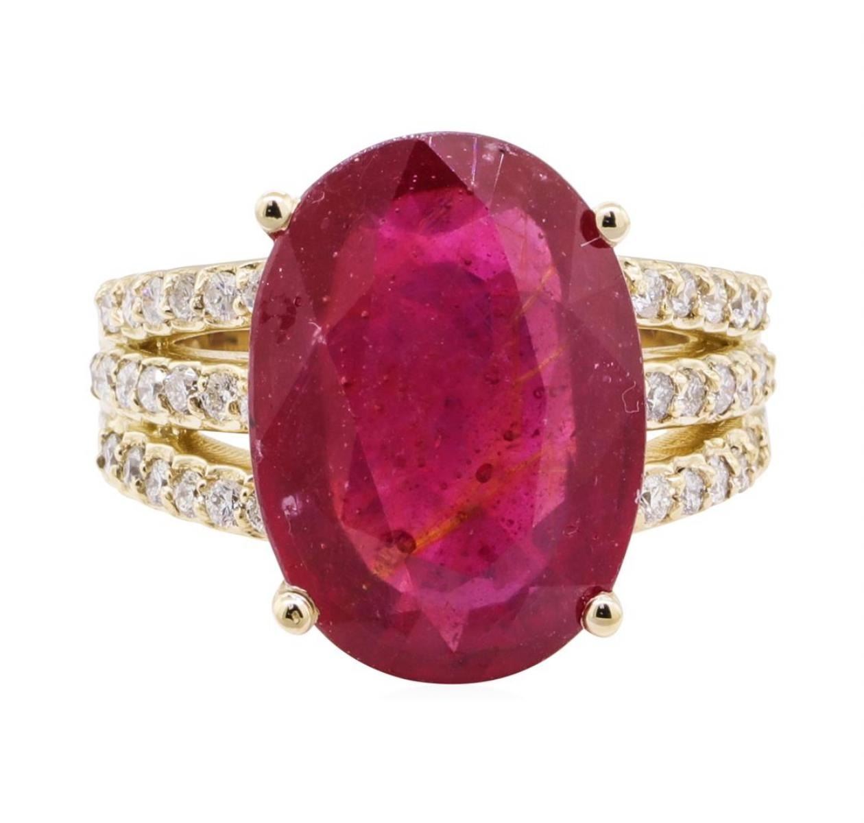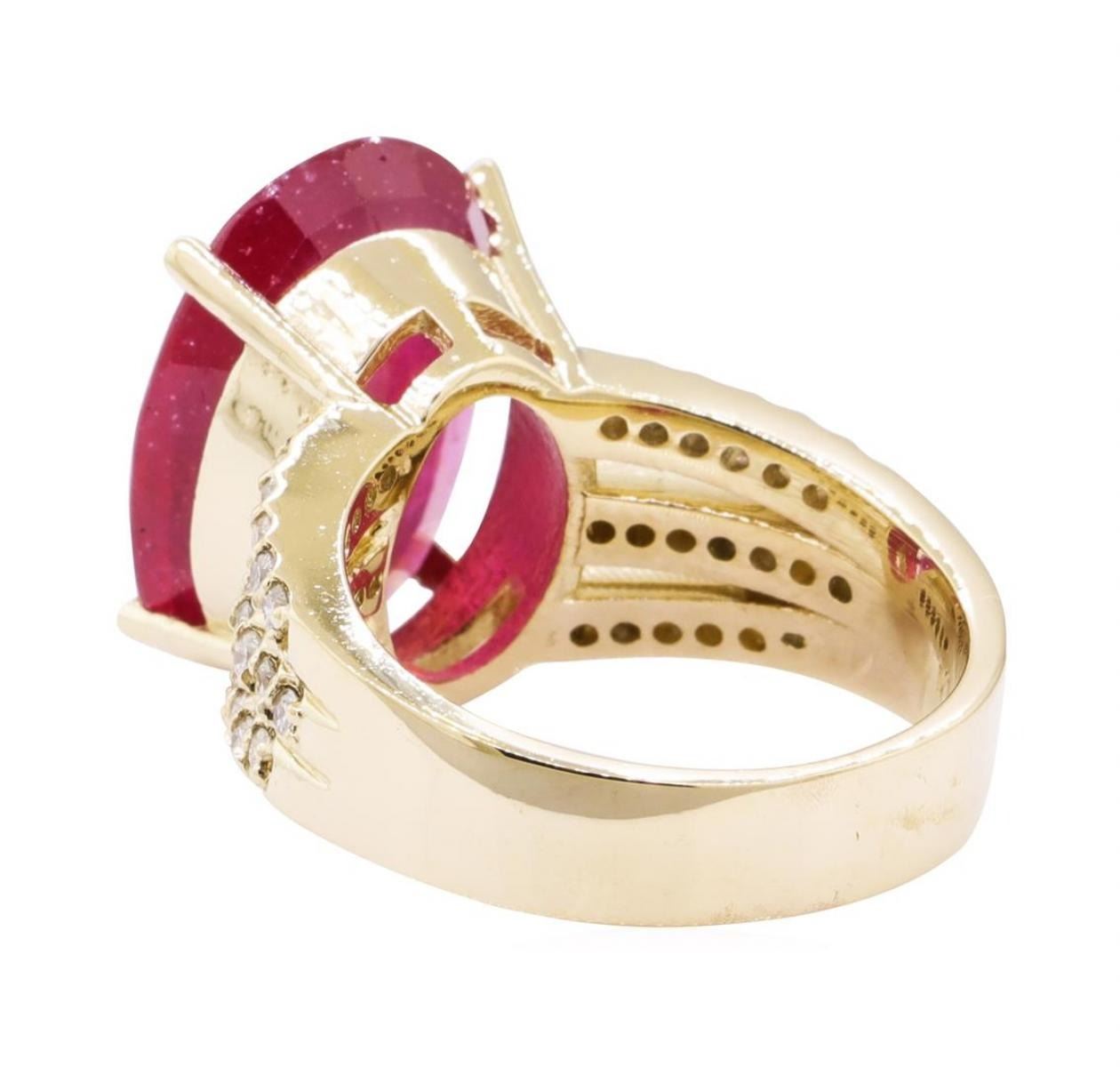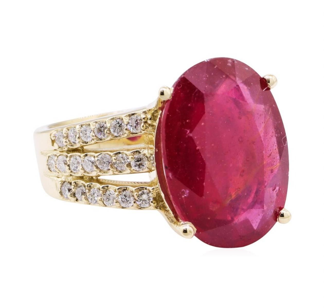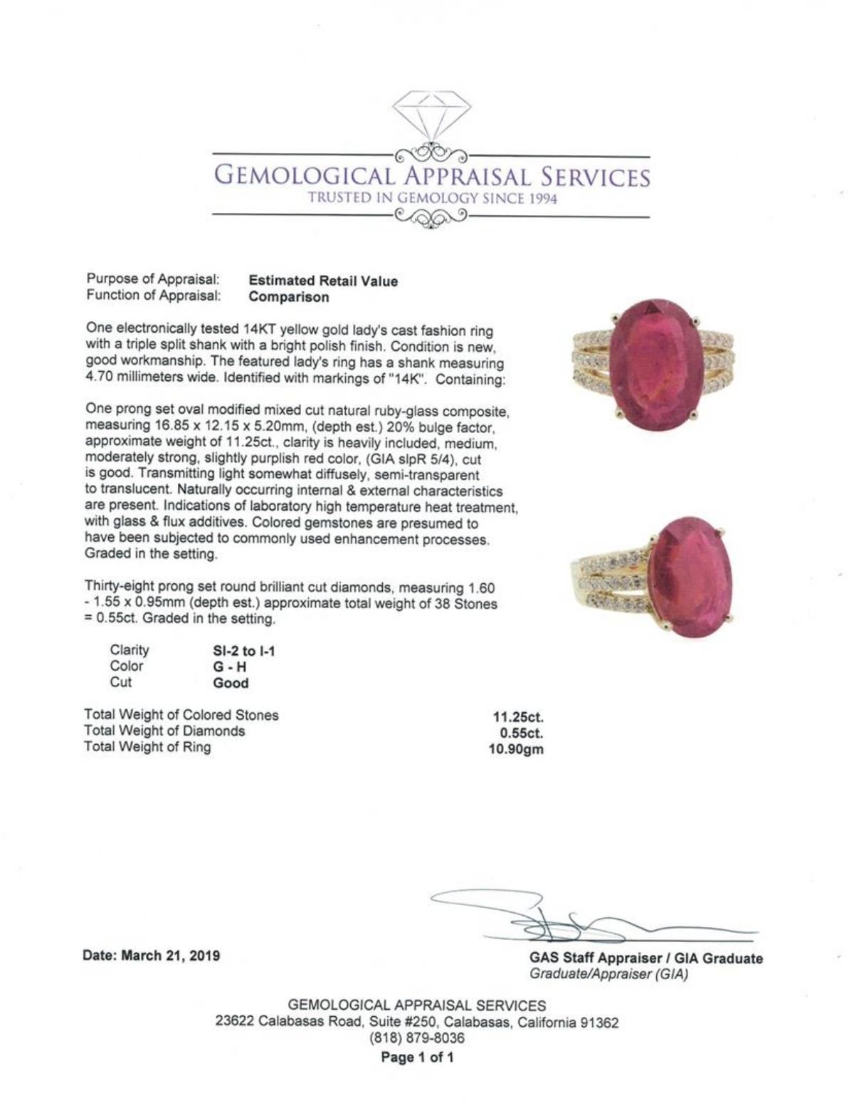 One electronically tested 14KT yellow gold lady's cast fashion ring with a triple split shank with a bright polish finish. The featured lady's ring has a shank measuring 4.70 millimeters wide. Identified with markings of '14K'. Condition is new, good workmanship. Containing: One prong set oval modified mixed cut natural ruby-glass composite, measuring 16.85 x 12.15 x 5.20mm, (depth est.) 20%. bulge factor, approximate weight of 11.25ct., clarity is heavily included, medium, moderately strong, slightly purplish red color, (GIA slpR 5/4), cut is good. Transmitting light somewhat diffusely, semi-transparent to translucent. Naturally occurring internal & external characteristics are present. Indications of laboratory high temperature heat treatment, with glass & flux additives. Colored gemstones are presumed to have been subjected to commonly used enhancement processes. Graded in the setting. Thirty-Eight prong set round brilliant cut diamonds, measuring 1.60 - 1.55 x 0.95mm (depth est.) approximate total weight of 38 Stones = 0.55ct. Graded in the setting. Color G - H Clarity SI-2 to I-1 Cut Good. Total Weight of Colored Stones 11.25ct.. Total Weight of Diamonds 0.55ct.. Total Weight of Ring 10.90gm GAS Appraised at $3615.00. GAS Appraised.