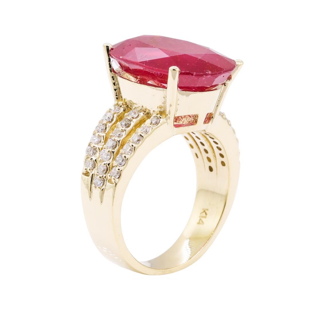 One electronically tested 14KT yellow gold lady's cast fashion ring with a triple split shank with a bright polish finish. The featured lady's ring has a shank measuring 4.70 millimeters wide. Identified with markings of '14K'. Condition is new, good workmanship. Containing: One prong set oval modified mixed cut natural ruby-glass composite, measuring 16.85 x 12.15 x 5.20mm, (depth est.) 20%. bulge factor, approximate weight of 11.25ct., clarity is heavily included, medium, moderately strong, slightly purplish red color, (GIA slpR 5/4), cut is good. Transmitting light somewhat diffusely, semi-transparent to translucent. Naturally occurring internal & external characteristics are present. Indications of laboratory high temperature heat treatment, with glass & flux additives. Colored gemstones are presumed to have been subjected to commonly used enhancement processes. Graded in the setting. Thirty-Eight prong set round brilliant cut diamonds, measuring 1.60 - 1.55 x 0.95mm (depth est.) approximate total weight of 38 Stones = 0.55ct. Graded in the setting. Color G - H Clarity SI-2 to I-1 Cut Good. Total Weight of Colored Stones 11.25ct.. Total Weight of Diamonds 0.55ct.. Total Weight of Ring 10.90gm GAS Appraised at $3615.00. GAS Appraised.