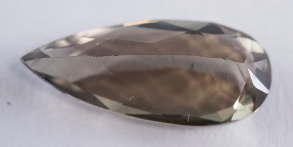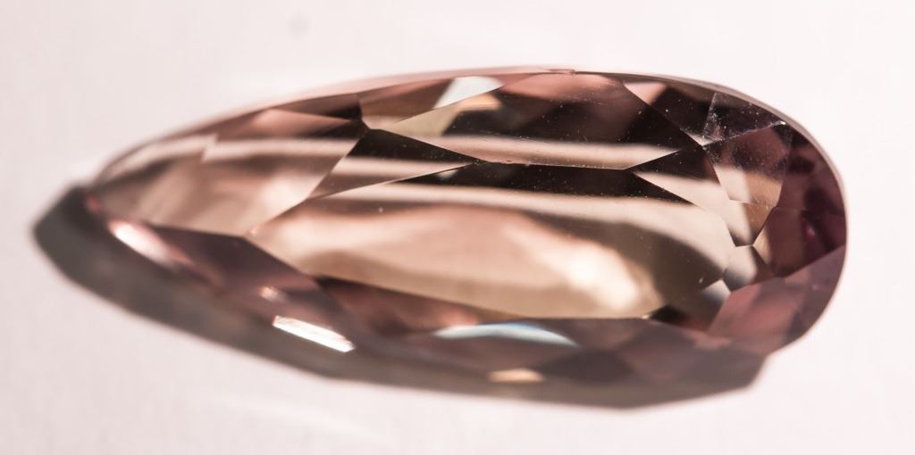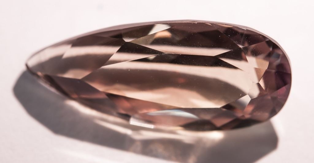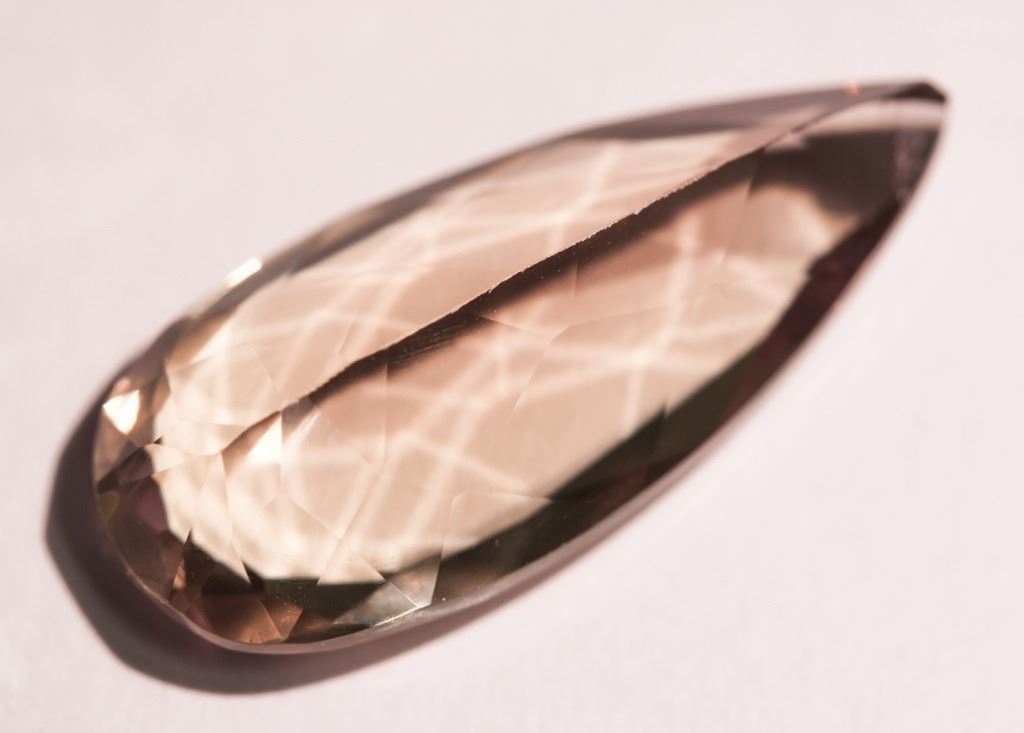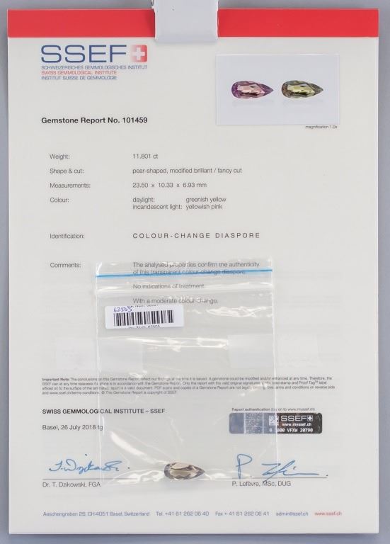 11.801 ct pear cut color changing diaspore. Also known as Zultanite and Csarite. Slight scratch at the tip of the gemstone. Accompanied with SSEF certificate. SSEF reference number: 0JB00VFXW20790. 23.50 x 10.33 x 6.93 mm.