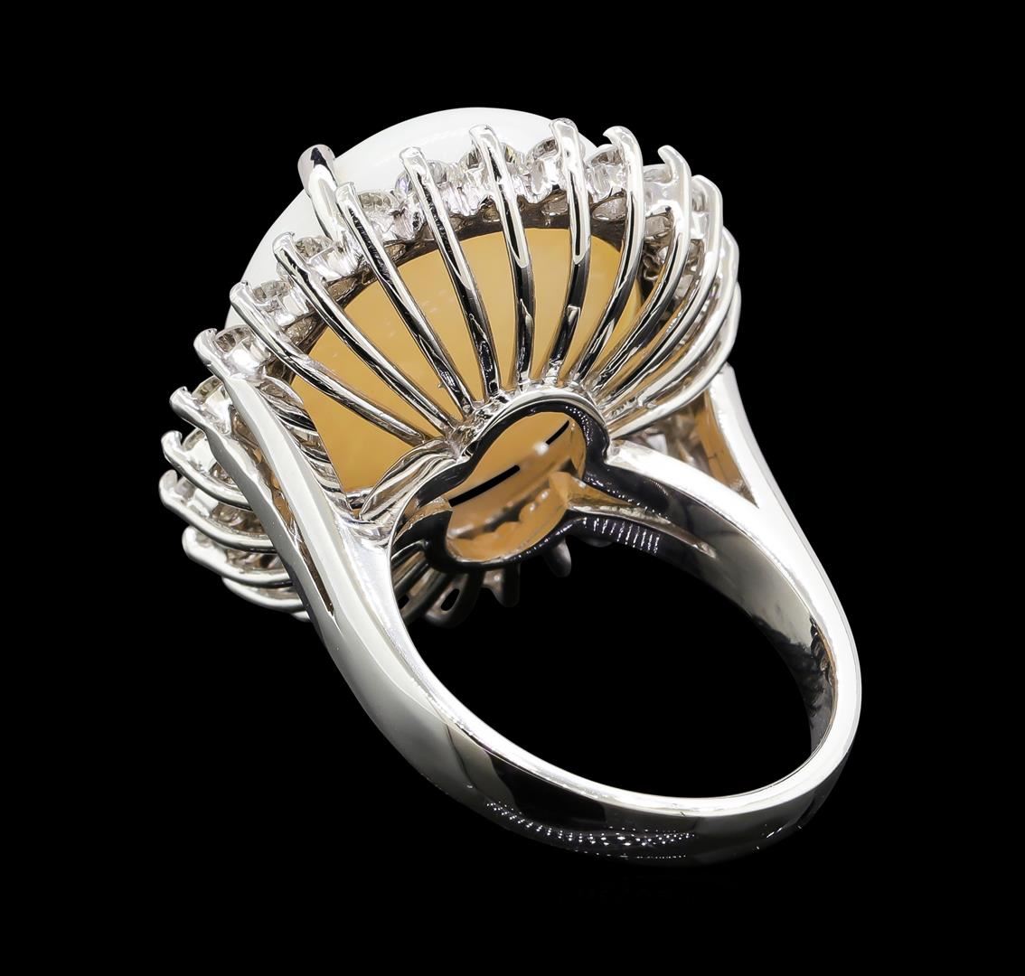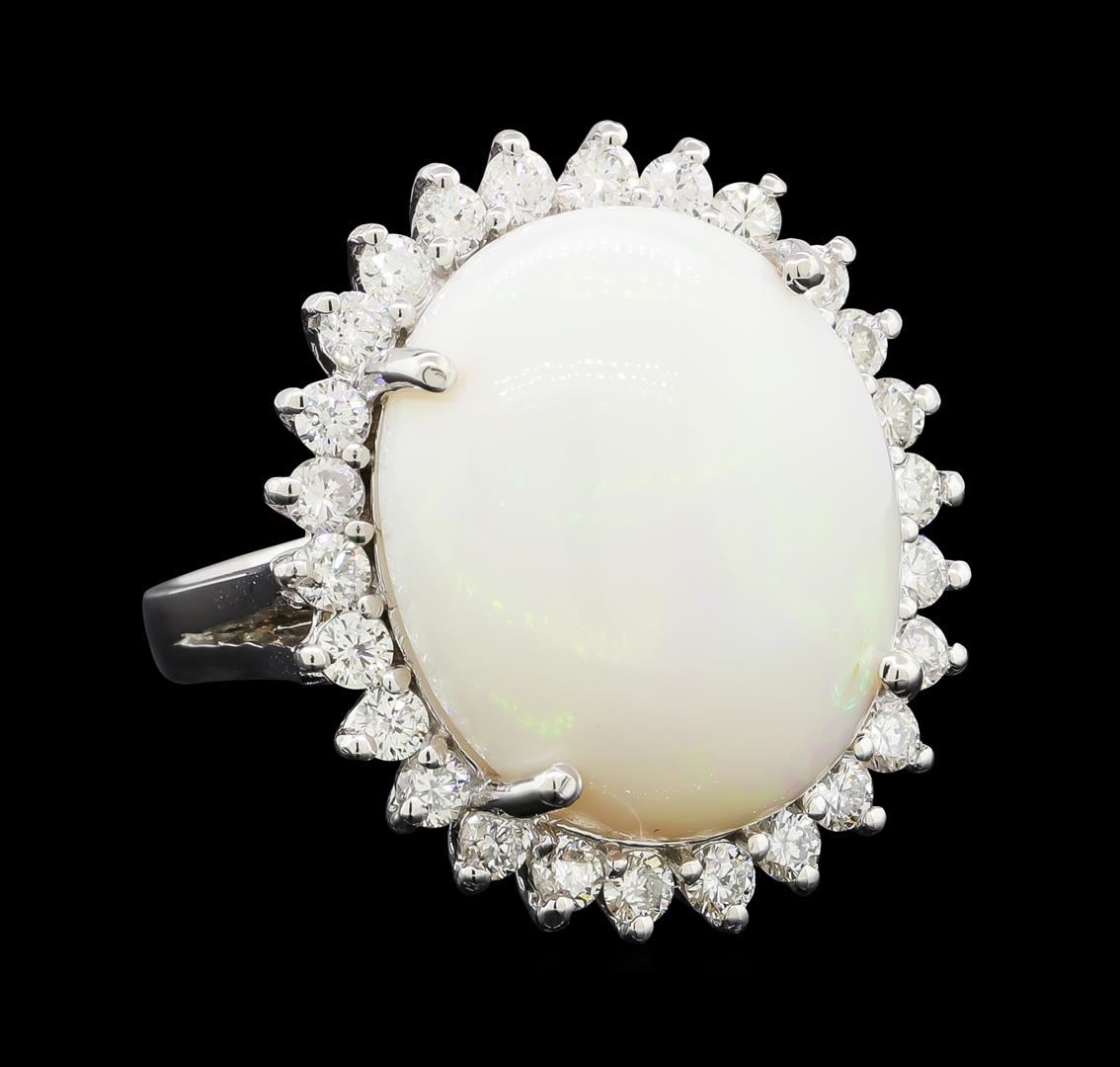 One electronically tested 14KT white gold lady's cast fashion ring with a basket halo with a bright polish finish. The featured lady's ring has a shank measuring 3.02 millimeters wide. Identified with markings of 'K14'. Condition is new, good workmanship. Containing: One crystal opal that is cut in a oval shaped cabochon and is prong set, measuring 19.91 mm long x 16.64 mm wide, and 8.96 mm thick and the approximate weight is 11.82 carats. The opal has a somewhat bright, blue-green play of color (fire) in a rolling flashfire pattern; a medium dome; a good cut; no inclusions; consistent in its brightness and pattern; and is not directional. Graded in the setting. Twenty-Six prong set round brilliant cut diamonds, measuring 2.50 - 2.40 x 1.47mm (depth est.) approximate total weight of 26 Stones = 1.40ct. Graded in the setting. Clarity SI-1 to SI-2. Color: G - H Cut Good. Total Weight of Diamonds 1.40ct.. Total Weight of Opals 11.82ct.. Total Weight of Ring 11.80gm. GAS Appraised at $6,475.00.