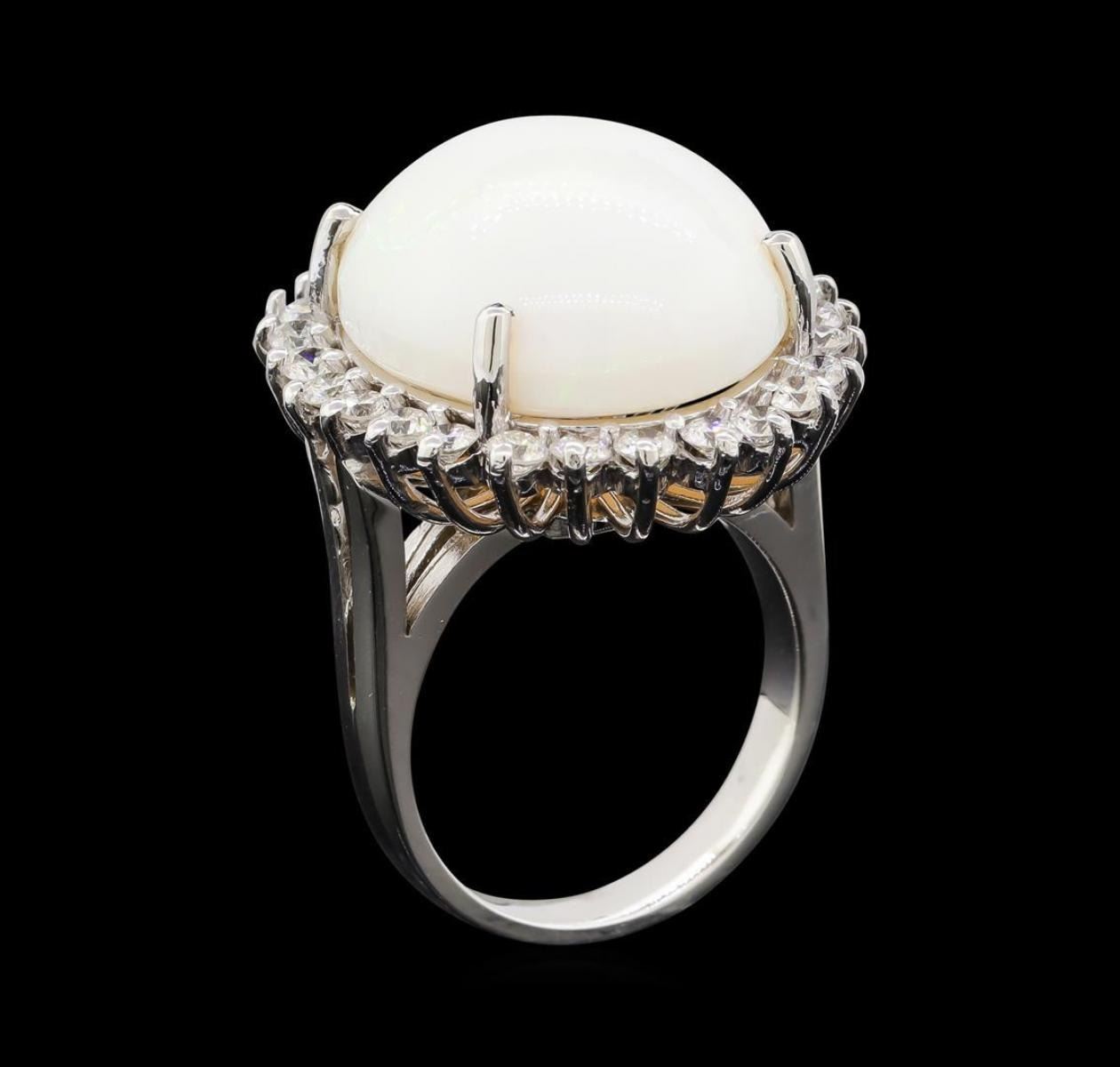 One electronically tested 14KT white gold lady's cast fashion ring with a basket halo with a bright polish finish. The featured lady's ring has a shank measuring 3.02 millimeters wide. Identified with markings of 'K14'. Condition is new, good workmanship. Containing: One crystal opal that is cut in a oval shaped cabochon and is prong set, measuring 19.91 mm long x 16.64 mm wide, and 8.96 mm thick and the approximate weight is 11.82 carats. The opal has a somewhat bright, blue-green play of color (fire) in a rolling flashfire pattern; a medium dome; a good cut; no inclusions; consistent in its brightness and pattern; and is not directional. Graded in the setting. Twenty-Six prong set round brilliant cut diamonds, measuring 2.50 - 2.40 x 1.47mm (depth est.) approximate total weight of 26 Stones = 1.40ct. Graded in the setting. Clarity SI-1 to SI-2. Color: G - H Cut Good. Total Weight of Diamonds 1.40ct.. Total Weight of Opals 11.82ct.. Total Weight of Ring 11.80gm. GAS Appraised.