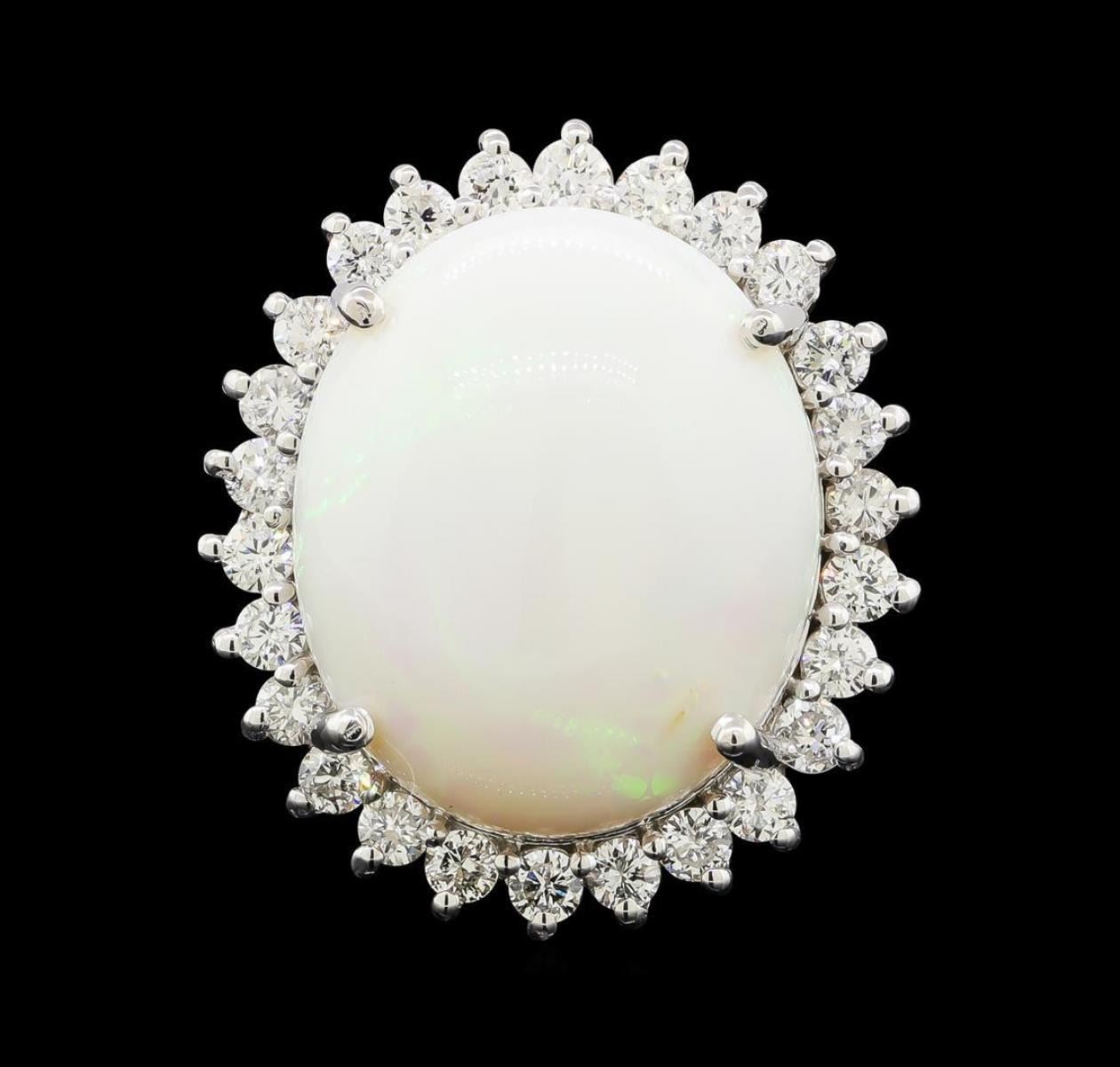 One electronically tested 14KT white gold lady's cast fashion ring with a basket halo with a bright polish finish. The featured lady's ring has a shank measuring 3.02 millimeters wide. Identified with markings of 'K14'. Condition is new, good workmanship. Containing: One crystal opal that is cut in a oval shaped cabochon and is prong set, measuring 19.91 mm long x 16.64 mm wide, and 8.96 mm thick and the approximate weight is 11.82 carats. The opal has a somewhat bright, blue-green play of color (fire) in a rolling flashfire pattern; a medium dome; a good cut; no inclusions; consistent in its brightness and pattern; and is not directional. Graded in the setting. Twenty-Six prong set round brilliant cut diamonds, measuring 2.50 - 2.40 x 1.47mm (depth est.) approximate total weight of 26 Stones = 1.40ct. Graded in the setting. Clarity SI-1 to SI-2. Color: G - H Cut Good. Total Weight of Diamonds 1.40ct.. Total Weight of Opals 11.82ct.. Total Weight of Ring 11.80gm. GAS Appraised.