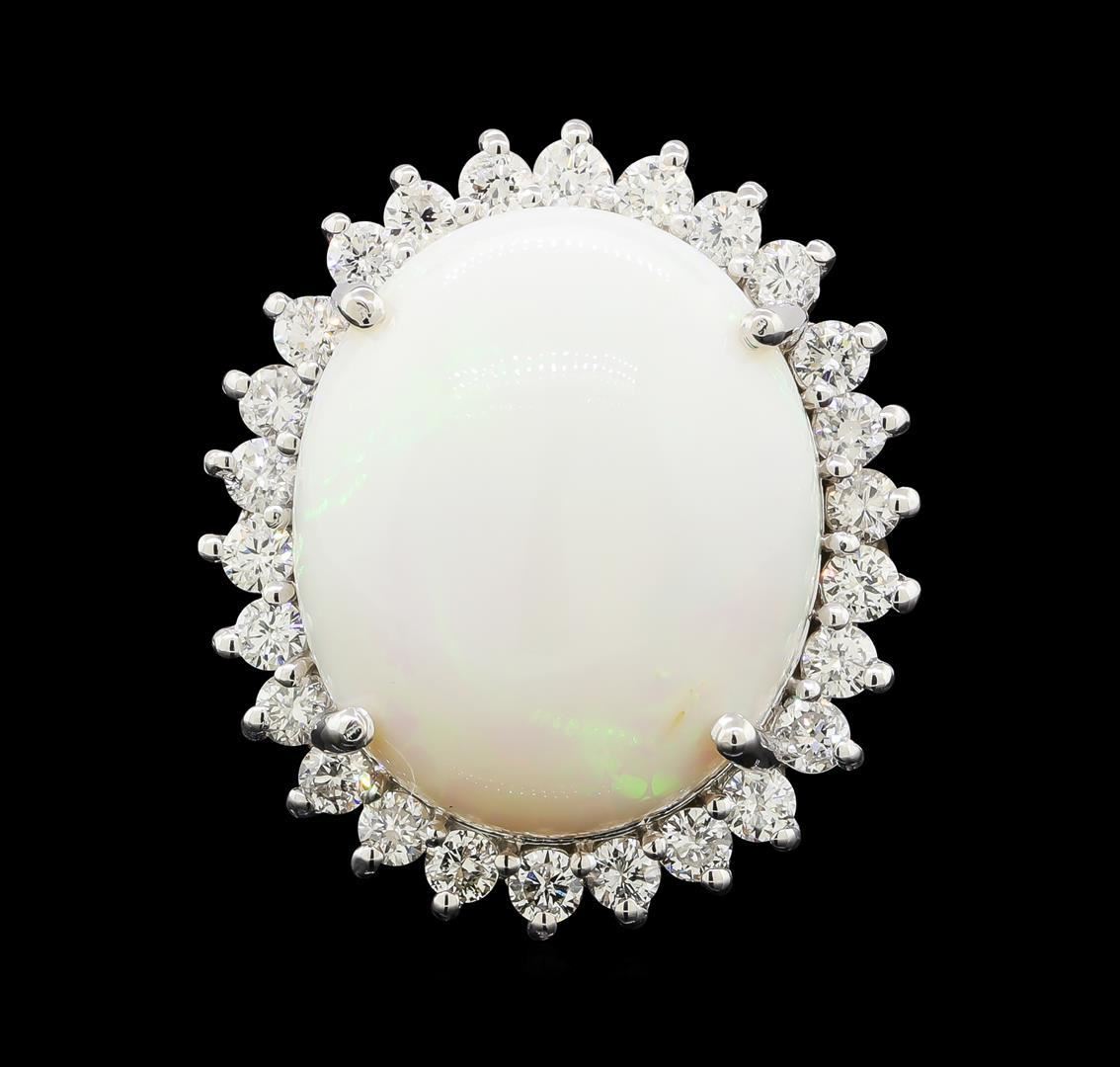 One electronically tested 14KT white gold lady's cast fashion ring with a basket halo with a bright polish finish. The featured lady's ring has a shank measuring 3.02 millimeters wide. Identified with markings of 'K14'. Condition is new, good workmanship. Containing: One crystal opal that is cut in a oval shaped cabochon and is prong set, measuring 19.91 mm long x 16.64 mm wide, and 8.96 mm thick and the approximate weight is 11.82 carats. The opal has a somewhat bright, blue-green play of color (fire) in a rolling flashfire pattern; a medium dome; a good cut; no inclusions; consistent in its brightness and pattern; and is not directional. Graded in the setting. Twenty-Six prong set round brilliant cut diamonds, measuring 2.50 - 2.40 x 1.47mm (depth est.) approximate total weight of 26 Stones = 1.40 ct. Graded in the setting. Clarity SI-1 to SI-2. Color: G - H Cut Good. Total Weight of Diamonds 1.40 ct.. Total Weight of Opals 11.82ct.. Total Weight of Ring 11.80gm. GAS Appraised.