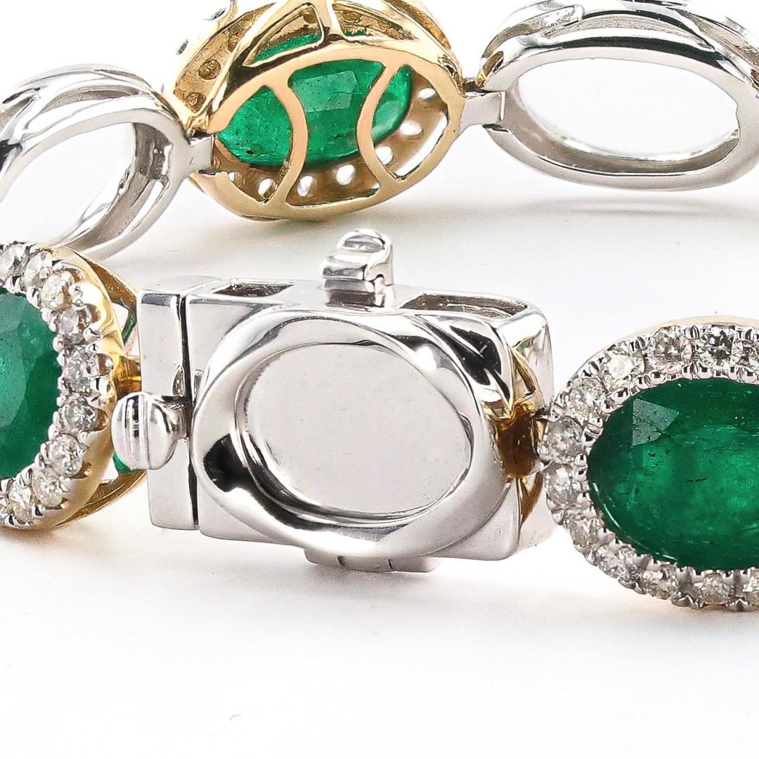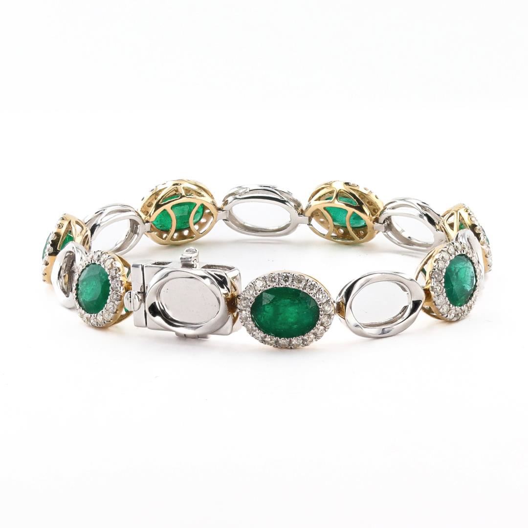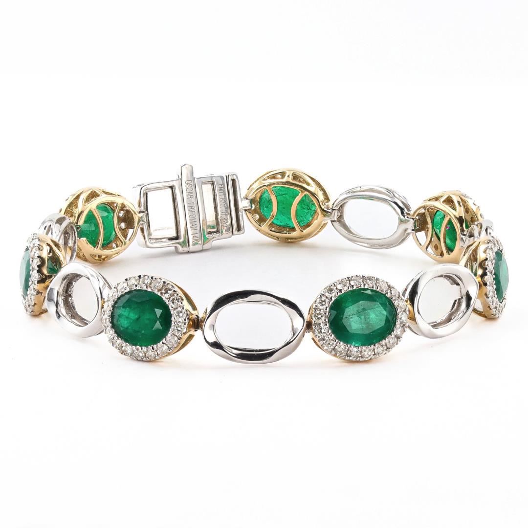 Fourteen karat (14K) two tone gold natural emerald beryl and diamond bracelet. Oval brilliant cut natural emerald beryl gemstones are mounted in the center of the bracelet. Round brilliant cut diamonds accent the bracelet around the center gemstones. The bracelet has a gross weight of 18.0 Grams. Trademark is "Oscar Friedman". #NATURAL GEMSTONE# GEMSTONE: Emerald Beryl NATURE: Natural SHAPE: Oval Brilliant, Faceted Cut WEIGHT: 11.83 carat total (7pcs.) DIMENSIONS: 9.2 x 7.0mm CLARITY: Type 3 COLOR: Green (5/5) SYMMETRY: Excellent COLOR INTENSITY: Intense TRANSPARENCY: Transparent TONE: Dark #NATURAL DIAMOND# SHAPE: Round Brilliant Cut WEIGHT: 1.82 carat total (126pcs.) DIMENSIONS: 1.6 x 1.5mm AVERAGE CLARITY: SI1-SI2 AVERAGE COLOR: G-H SYMMETRY: Excellent POLISH: Excellent #METAL# METAL: Gold PURITY: 14K COLOR: Two Tone (White & Yellow) CONDITION: Excellent FINISH: High Polish #LREF-12353