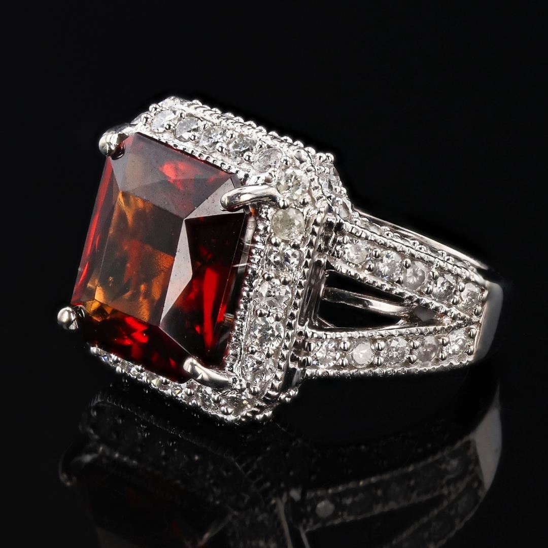 DESCRIPTION: ONE 14K WHITE GOLD CUSTOM MADE LADY'S DIAMOND & SPESSARTITE GARNET RING . 14.00 GR T #1 - MAIN CENTER GEMSTONE(S):# IDENTITY : ONE CENTER NATURAL SPESSARTITE GARNET SET IN PRONGS SETTING STYLE CARAT WEIGHT : 11.83 CTS SHAPE & MEASUREMEMT : EMERALD CUT QUALITY : DEEP ORANGE/BROWNISH #2 - ADJACENT GEMSTONES:# IDENTITY : NATURAL DIAMONDS SHAPE : ROUND BRILLIANT CUT CARAT WEIGHT : 2.36 CTS QUALITY : F/G COLOR & SI/I CLARITY RANGE ALL FINE CUTTING AND PROPORTIONS ALL PRONGS SETTINGS STYLE COLOR & CLARITY ARE GRADED AS MOUNTED TOTAL GEMSTONES WEIGHT : 14.19 CTS TW. Size: 7