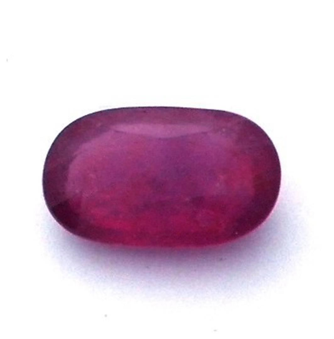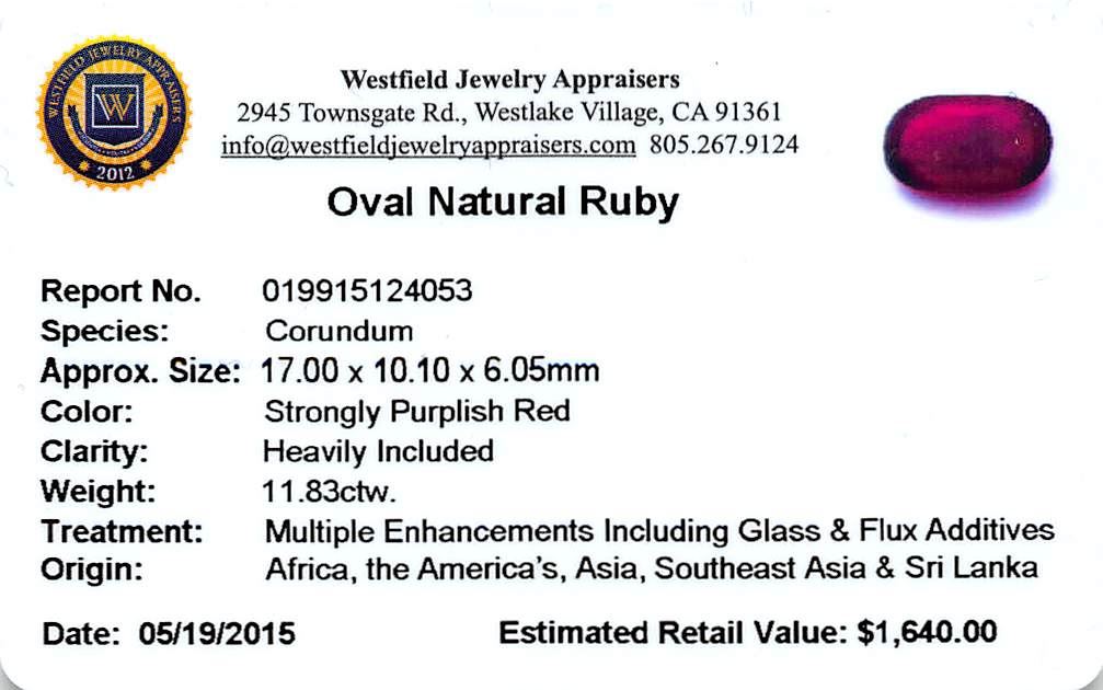 One oval mixed cut natural ruby, measuring 17.00 x 10.10 x 6.05mm, exact weight 11.83ct., clarity is heavily included, type II, dark, very slightly brownish, strongly purplish red color, (GIA stpR 7/3), cut is good. Transmitting light somewhat diffusely, translucent. Naturally occurring internal & external characteristics are present. Indications of laboratory high temperature heat treatment, with glass & flux additives. Westfield Appraised at $1,640.00.