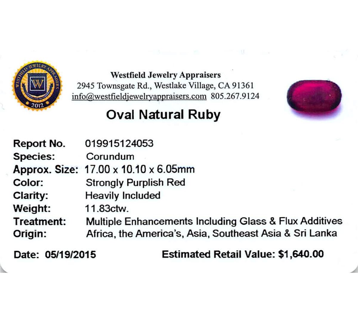 One oval mixed cut natural ruby, measuring 17.00 x 10.10 x 6.05mm, exact weight 11.83ct., clarity is heavily included, type II, dark, very slightly brownish, strongly purplish red color, (GIA stpR 7/3), cut is good. Transmitting light somewhat diffusely, translucent. Naturally occurring internal & external characteristics are present. Indications of laboratory high temperature heat treatment, with glass & flux additives. Westfield Appraised at $1,640.00.