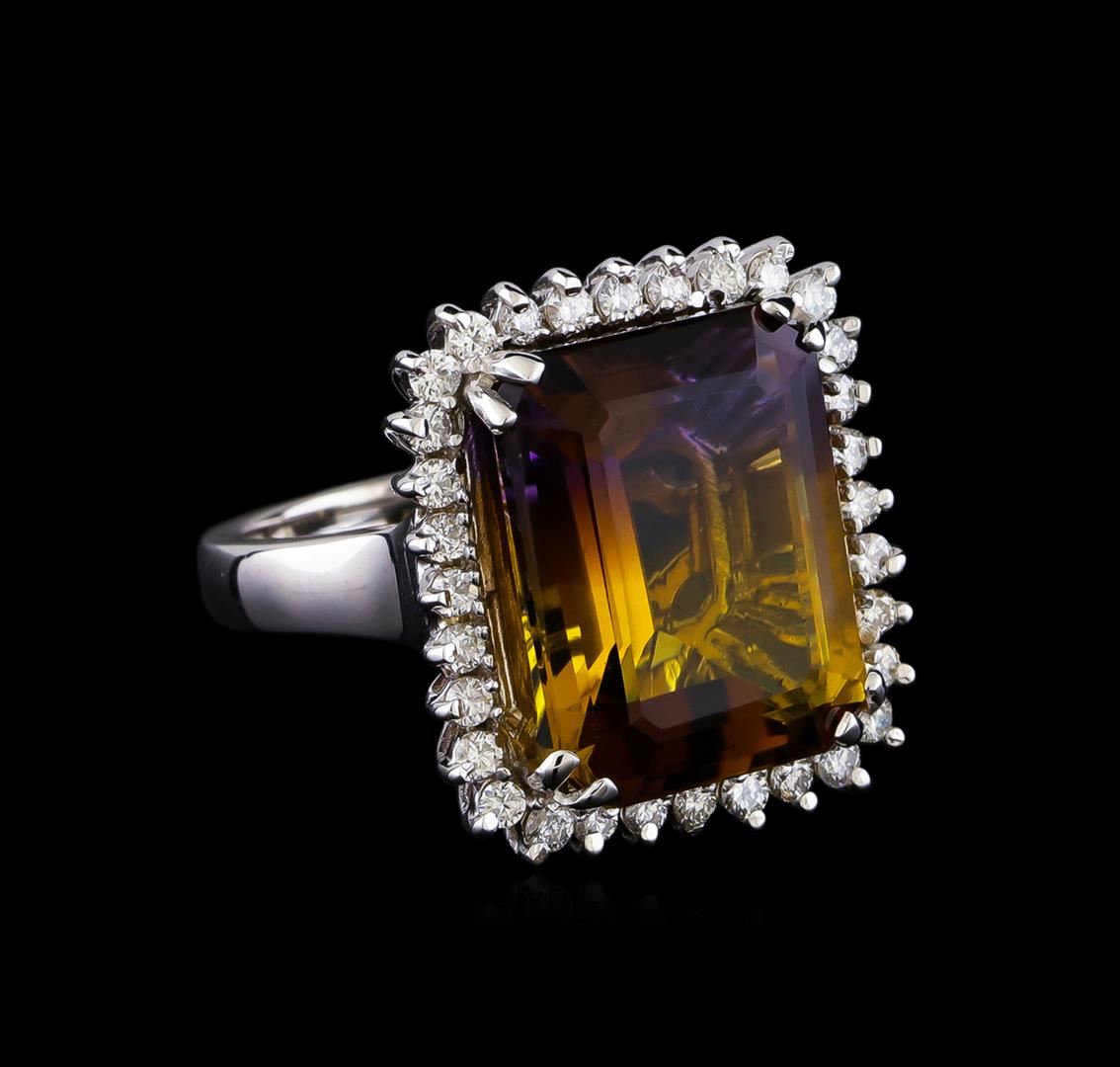 One electronically tested 14KT white gold lady's cast fashion ring with a basket halo with a bright polish finish. The featured lady's ring has a shank measuring 2.89 millimeters in width. Identified with markings of "14K". Condition is new, good workmanship. Containing: One prong set emerald step cut natural ametrine quartz, measuring 16.22 x 12.32 x 8.05mm, (depth est.) approximate weight of 11.85ct., clarity is eye clean, medium, moderately strong, purple color, (GIA P 5/4) to medium, moderately strong, yellowish orange, (GIA yO 5/4), cut is very good. Transmitting light with no distortion, transparent. Colored gemstones are presumed to have been subjected to commonly used enhancement processes. Graded in the setting. Thirty-Two prong set round brilliant cut diamonds, measuring 1.80 - 1.70 x 1.09mm (depth est.) approximate total weight of 32 Stones = 0.65ct. Graded in the setting. Clarity: SI-1 to SI-2. Color: H - I. Cut Good. Total Weight of Colored Stones 11.85ct. Total Weight of Diamonds 0.65ct. Total Weight of Ring 11.50gm. GAS Appraised at $3,825.00.