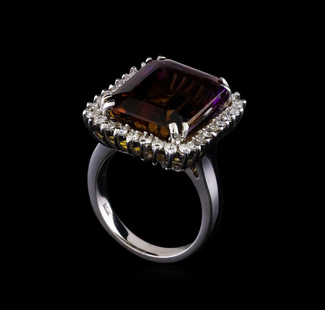 One electronically tested 14KT white gold lady's cast fashion ring with a basket halo with a bright polish finish. The featured lady's ring has a shank measuring 2.89 millimeters in width. Identified with markings of "14K". Condition is new, good workmanship. Containing: One prong set emerald step cut natural ametrine quartz, measuring 16.22 x 12.32 x 8.05mm, (depth est.) approximate weight of 11.85ct., clarity is eye clean, medium, moderately strong, purple color, (GIA P 5/4) to medium, moderately strong, yellowish orange, (GIA yO 5/4), cut is very good. Transmitting light with no distortion, transparent. Colored gemstones are presumed to have been subjected to commonly used enhancement processes. Graded in the setting. Thirty-Two prong set round brilliant cut diamonds, measuring 1.80 - 1.70 x 1.09mm (depth est.) approximate total weight of 32 Stones = 0.65ct. Graded in the setting. Clarity: SI-1 to SI-2. Color: H - I. Cut Good. Total Weight of Colored Stones 11.85ct. Total Weight of Diamonds 0.65ct. Total Weight of Ring 11.50gm. GAS Appraised at $3,825.00.