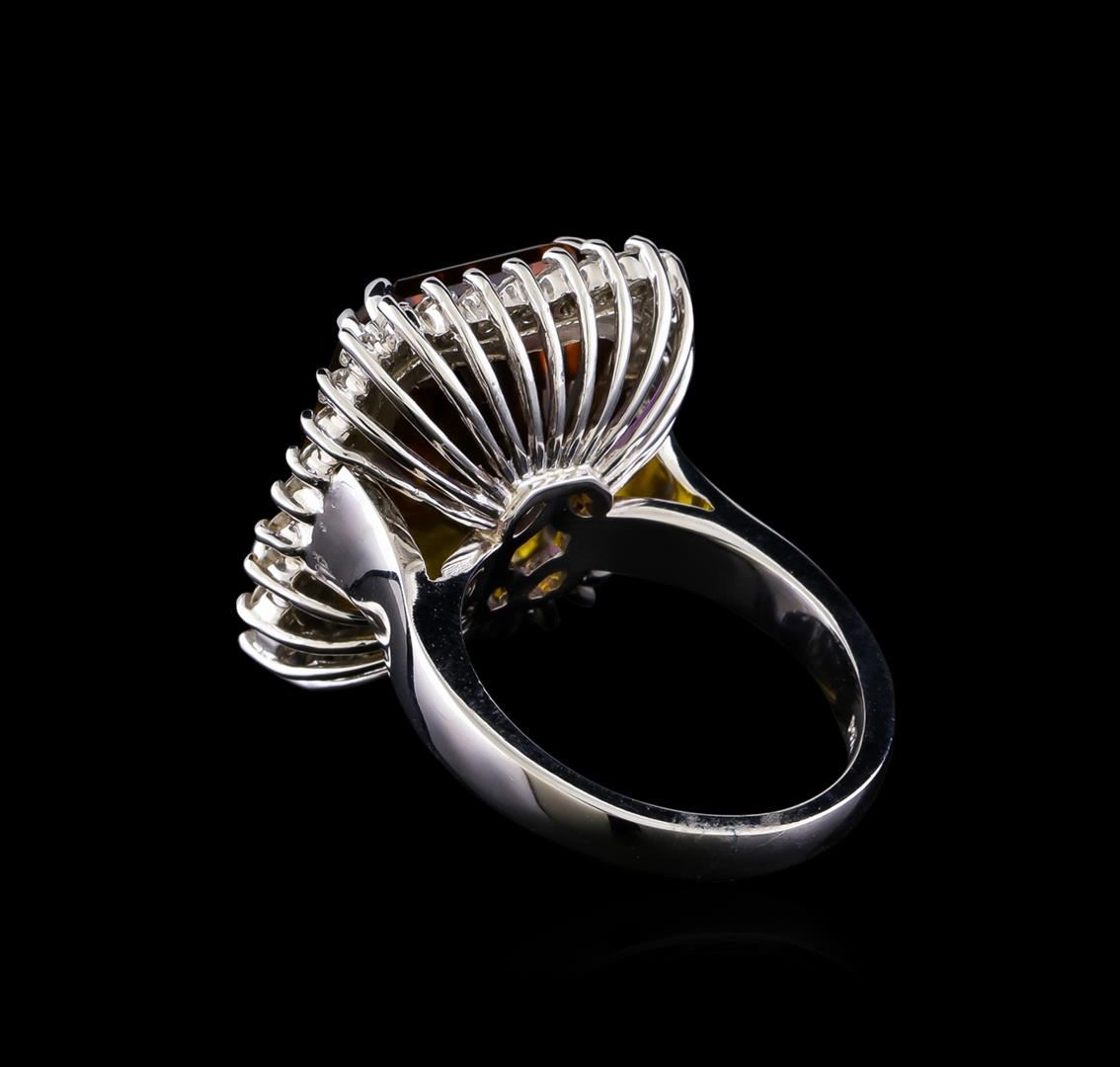 One electronically tested 14KT white gold lady's cast fashion ring with a basket halo with a bright polish finish. The featured lady's ring has a shank measuring 2.89 millimeters in width. Identified with markings of "14K". Condition is new, good workmanship. Containing: One prong set emerald step cut natural ametrine quartz, measuring 16.22 x 12.32 x 8.05mm, (depth est.) approximate weight of 11.85ct., clarity is eye clean, medium, moderately strong, purple color, (GIA P 5/4) to medium, moderately strong, yellowish orange, (GIA yO 5/4), cut is very good. Transmitting light with no distortion, transparent. Colored gemstones are presumed to have been subjected to commonly used enhancement processes. Graded in the setting. Thirty-Two prong set round brilliant cut diamonds, measuring 1.80 - 1.70 x 1.09mm (depth est.) approximate total weight of 32 Stones = 0.65ct. Graded in the setting. Clarity: SI-1 to SI-2. Color: H - I. Cut Good. Total Weight of Colored Stones 11.85ct. Total Weight of Diamonds 0.65ct. Total Weight of Ring 11.50gm. GAS Appraised at $3,825.00.