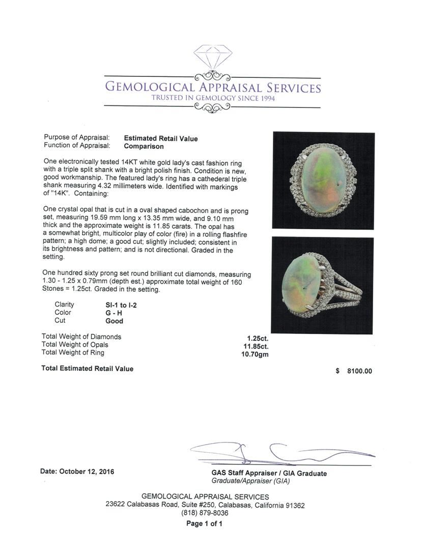 One electronically tested 14KT white gold lady's cast fashion ring with a triple split shank with a bright polish finish. The featured lady's ring has a cathedral triple shank measuring 4.32 millimeters wide. Identified with markings of '14K'. Condition is new, good workmanship. Containing: One crystal opal that is cut in a oval shaped cabochon and is prong set, measuring 19.59 mm long x 13.35 mm wide, and 9.10 mm thick and the approximate weight is 11.85 carats. The opal has a somewhat bright, multicolor play of color (fire) in a rolling flashfire pattern; a high dome; a good cut; slightly included; consistent in its brightness and pattern; and is not directional. Graded in the setting. One Hundred Sixty prong set round brilliant cut diamonds, measuring 1.30 - 1.25 x 0.79mm (depth est.) approximate total weight of 160 Stones = 1.25ct. Graded in the setting. Clarity SI-1 to I-2. Color: G - H Cut Good. Total Weight of Diamonds 1.25ct.. Total Weight of Opals 11.85ct.. Total Weight of Ring 10.70gm. GAS Appraised at $8,100.00.