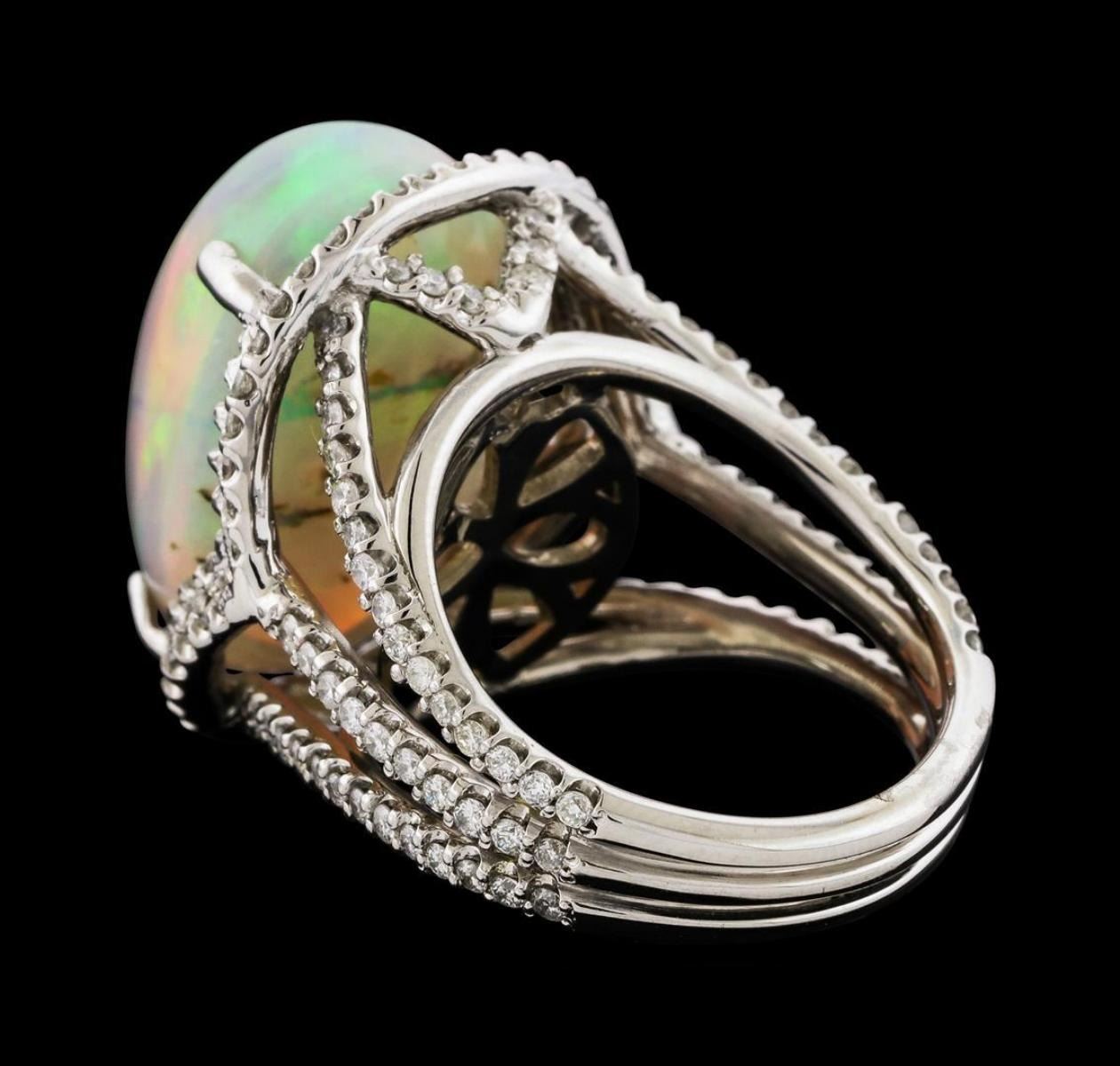One electronically tested 14KT white gold lady's cast fashion ring with a triple split shank with a bright polish finish. The featured lady's ring has a cathedral triple shank measuring 4.32 millimeters wide. Identified with markings of '14K'. Condition is new, good workmanship. Containing: One crystal opal that is cut in a oval shaped cabochon and is prong set, measuring 19.59 mm long x 13.35 mm wide, and 9.10 mm thick and the approximate weight is 11.85 carats. The opal has a somewhat bright, multicolor play of color (fire) in a rolling flashfire pattern; a high dome; a good cut; slightly included; consistent in its brightness and pattern; and is not directional. Graded in the setting. One Hundred Sixty prong set round brilliant cut diamonds, measuring 1.30 - 1.25 x 0.79mm (depth est.) approximate total weight of 160 Stones = 1.25ct. Graded in the setting. Clarity SI-1 to I-2. Color: G - H Cut Good. Total Weight of Diamonds 1.25ct.. Total Weight of Opals 11.85ct.. Total Weight of Ring 10.70gm. GAS Appraised.