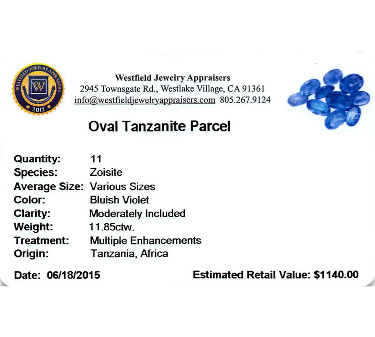 Eleven oval mixed cut natural tanzanites exact total weight 11.85ct., clarity is moderately included, type I, medium dark, very slightly grayish, bluish violet color, (GIA bV 6/3), cut is good. Transmitting light with a minimum of distortion, transparent. Naturally occurring internal & external characteristics are present. Color grade is an average for the group. Tanzanite is a very rare gemstone that is only found in the country of Tanzania. Originally discovered in 1967. Tiffany & Company, named the stone Tanzanite. It is found in the Usumburu Mountains that border the Umba Valley of northern Tanzania. Tanzanite occurs in gray, brown, violet, blue, reddish-purple, & green. The gem is interesting because of its exceptional pleochroism. Rotated in different directions a tanzanite will exhibit multiple changes of color. Tanzanite has a low tolerance to ultrasonic cleaning, and should not be cleaned using this method. Westfield Appraised at $1,140.00.
