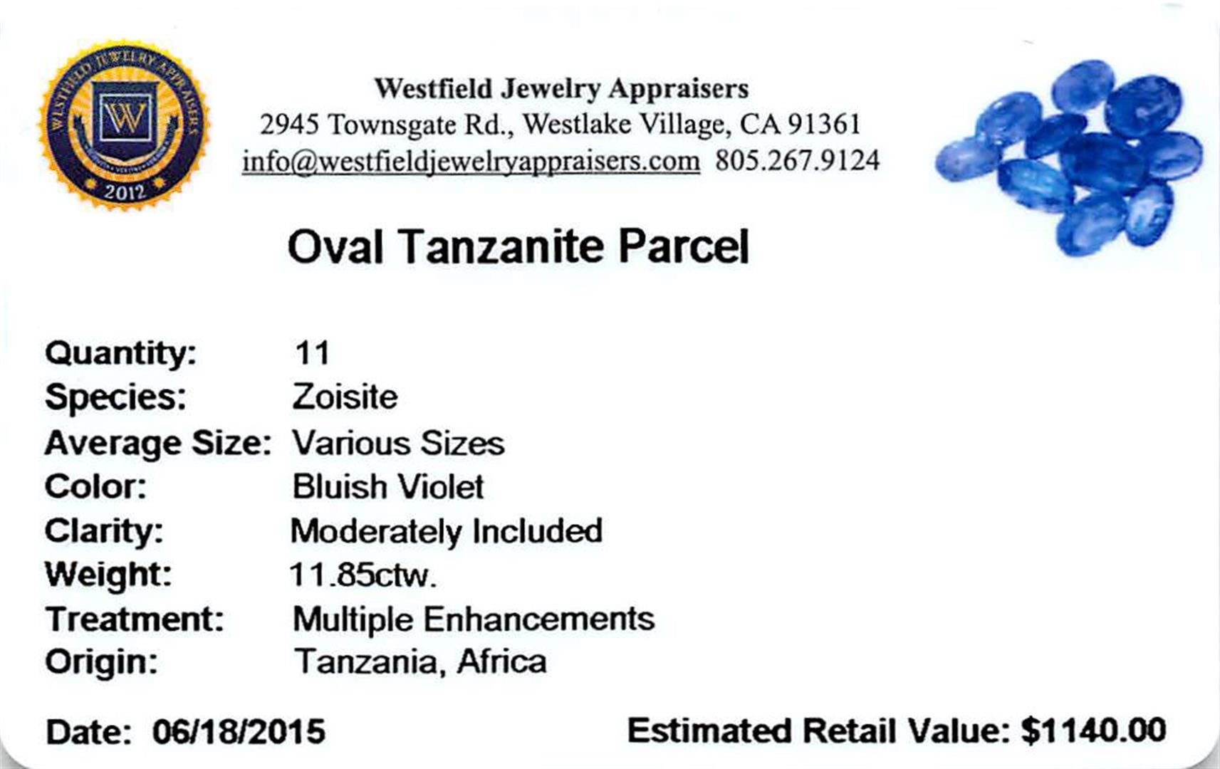 Eleven oval mixed cut natural tanzanites exact total weight 11.85ct., clarity is moderately included, type I, medium dark, very slightly grayish, bluish violet color, (GIA bV 6/3), cut is good. Transmitting light with a minimum of distortion, transparent. Naturally occurring internal & external characteristics are present. Color grade is an average for the group. Tanzanite is a very rare gemstone that is only found in the country of Tanzania. Originally discovered in 1967. Tiffany & Company, named the stone Tanzanite. It is found in the Usumburu Mountains that border the Umba Valley of northern Tanzania. Tanzanite occurs in gray, brown, violet, blue, reddish-purple, & green. The gem is interesting because of its exceptional pleochroism. Rotated in different directions a tanzanite will exhibit multiple changes of color. Tanzanite has a low tolerance to ultrasonic cleaning, and should not be cleaned using this method. Westfield Appraised at $1,140.00.