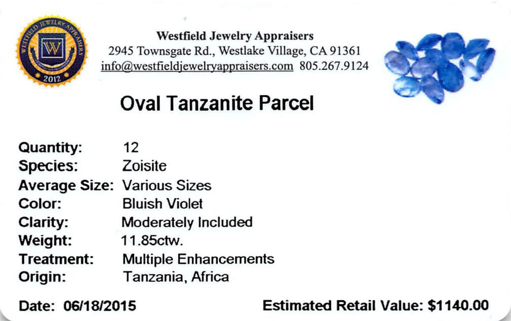 Twelve oval mixed cut natural tanzanites exact total weight 11.85ct., clarity is moderately included, type I, medium dark, very slightly grayish, bluish violet color, (GIA bV 6/3), cut is good. Transmitting light with a minimum of distortion, transparent. Naturally occurring internal & external characteristics are present. Color grade is an average for the group. Tanzanite is a very rare gemstone that is only found in the country of Tanzania. Originally discovered in 1967. Tiffany & Company, named the stone Tanzanite. It is found in the Usumburu Mountains that border the Umba Valley of northern Tanzania. Tanzanite occurs in gray, brown, violet, blue, reddish-purple, & green. The gem is interesting because of its exceptional pleochroism. Rotated in different directions a tanzanite will exhibit multiple changes of color. Tanzanite has a low tolerance to ultrasonic cleaning, and should not be cleaned using this method. Westfield Appraised at $1,140.00.