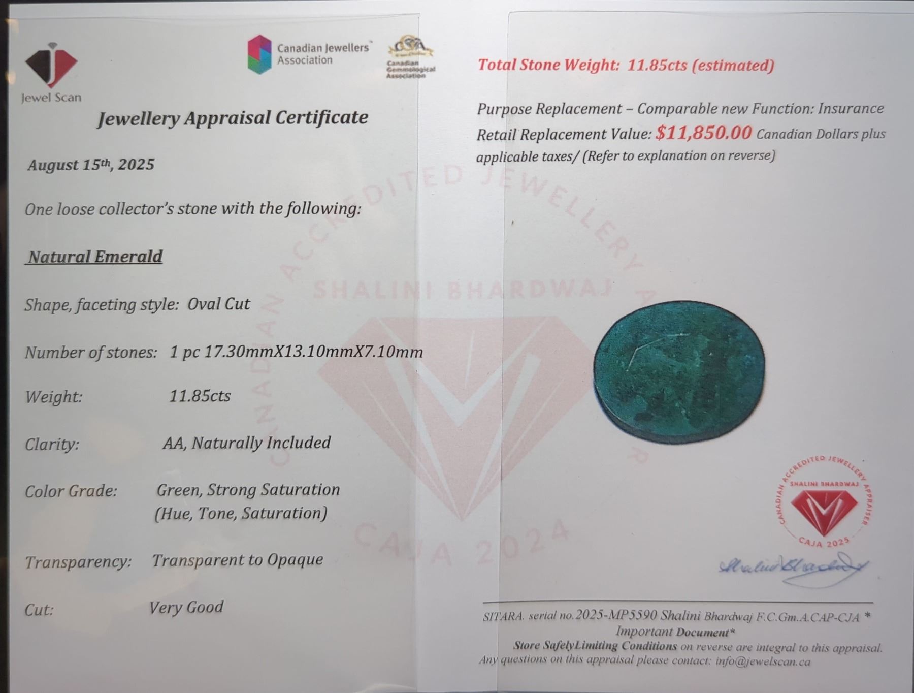 $11,850 Appraisal - 11.85 ct Cert. Emerald gemstone