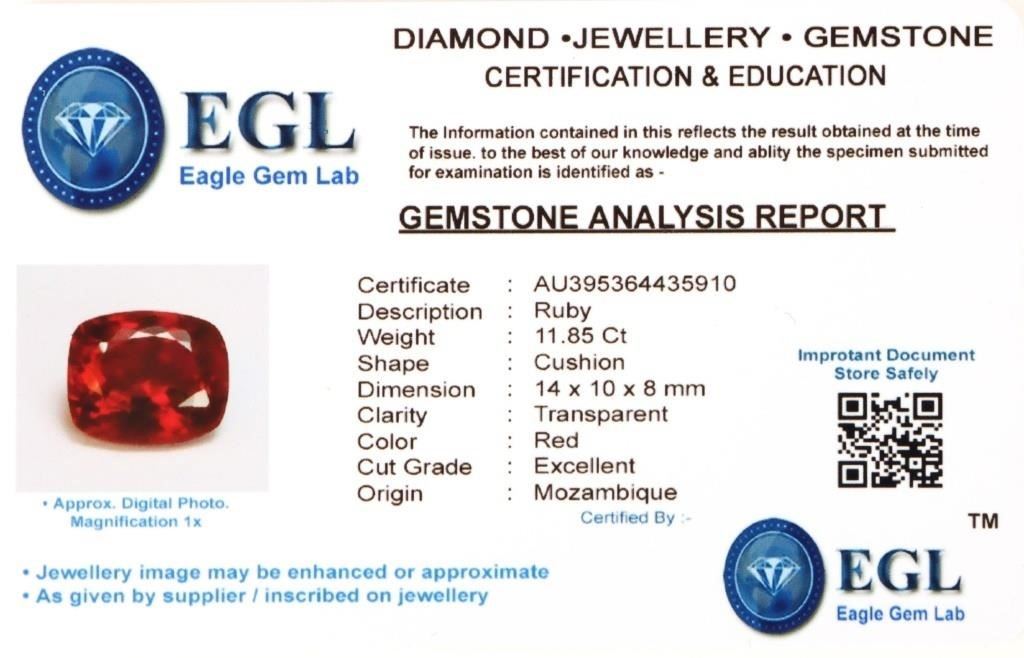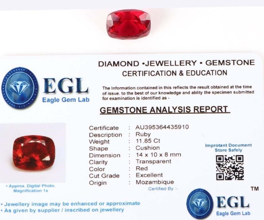 11.85ct cushion-cut red ruby loose gemstone with EGL certification. Gemstone has been electronically tested and identified, tester does not distinguish between lab-creations and natural gemstones.