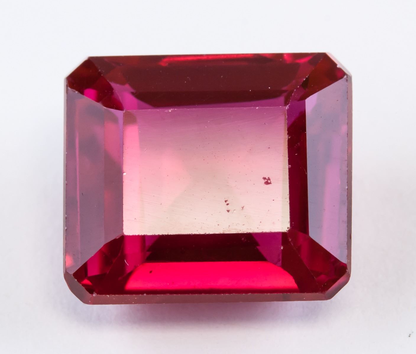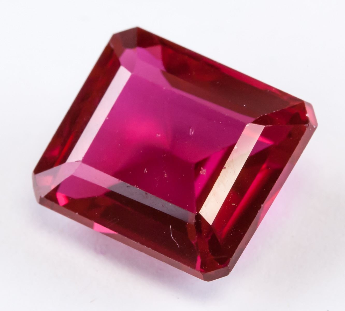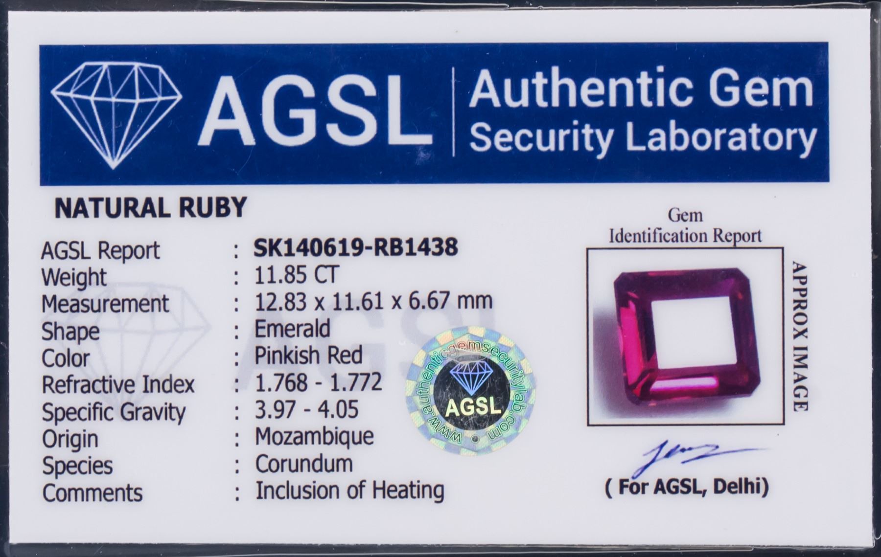 One (1) 11.85ct pinkish red natural ruby gemstone. Emerald cut. With AGSL certificate. 12.83 x 11.61 x 6.67 mm, Density: 3.97