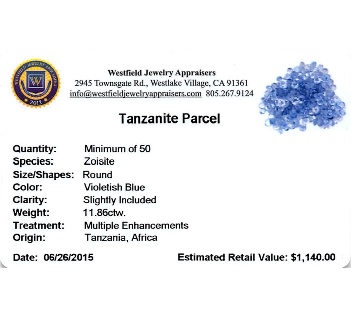 Fifty round mixed cut natural tanzanites, measuring 2.00 - 2.00 x 1.30 mm, exact total weight 11.86ct., clarity is slightly included, type I, medium, very slightly grayish, violetish blue color, (GIA vB 5/3), cut is good. Measurements & the color grade are an average for the group, Color grade is an average for the group, Transmitting light with no distortion, transparent, Naturally occurring internal & external characteristics are present, Indications of multiple laboratory enhancements, including high temperature heat treatment. Westfield Appraised at $1,140.00.