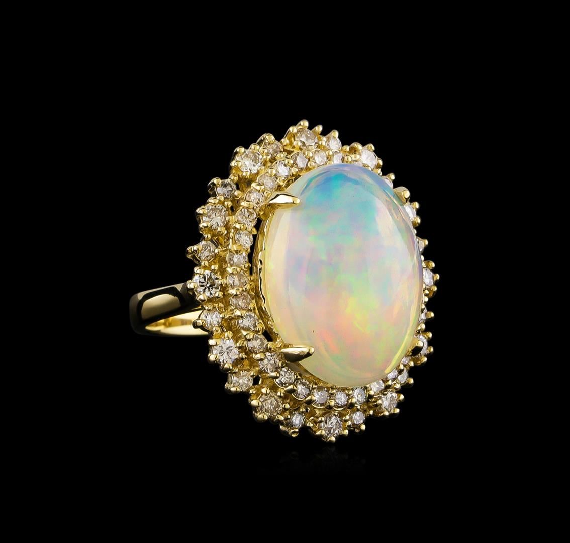 One electronically tested 14KT yellow gold ladies cast opal and diamond ring with a bright polish finish. The featured opal is set within tiered diamond floret bezel, completed by a three millimeter wide band. Identified with markings of "K14". Condition is new, good workmanship. Containing: One crystal opal that is cut in a oval shaped cabochon and is prong set, measuring 18.25 mm long x 13.62 mm wide, and 7.60 mm thick and the approximate weight is 11.88 carats. The opal has a bright, multicolor play of color (fire) in a flashfire pattern; a high dome; a good cut; no inclusions; consistent in its brightness and pattern; and is not directional. Graded in the setting. Twelve prong set round brilliant cut diamonds, measuring 2.20 - 2.20 x 1.32mm (depth est.) approximate total weight of 12 Stones = 0.50ct. Graded in the setting. Clarity: SI-1 to SI-2. Color: H - J Forty-Four prong set round brilliant cut diamonds, measuring 1.80 - 1.70 x 1.05mm (depth est.) approximate total weight of 44 Stones = 0.96ct. Graded in the setting. Clarity: SI-1 to I-1. Color: H - J. Total Weight of Diamonds 1.46ct. Total Weight of Opals 11.88ct. Total Weight of Ring 11.22gm. AIG Appraised at $10,175.00.