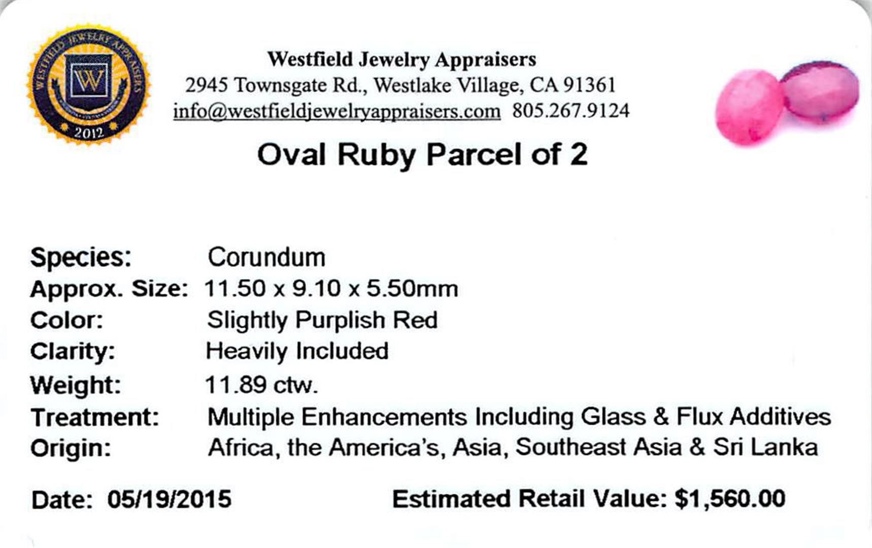 Two oval mixed cut natural rubies, measuring 11.50 x 9.10 x 5.50mm, exact total weight 11.89ct., clarity is heavily included, type II, dark, very slightly brownish, slightly purplish red color, (GIA slpR 7/3), cut is good. Measurements are an average for the pair. Transmitting light somewhat diffusely, transparent to translucent. Naturally occurring internal & external characteristics are present. Indications of laboratory high temperature heat treatment, with glass & flux additives. Ruby has a low tolerance to rhodium plating, repolishing the surface, & ultrasonic cleaning. Westfield Appraised at $1,560.00.