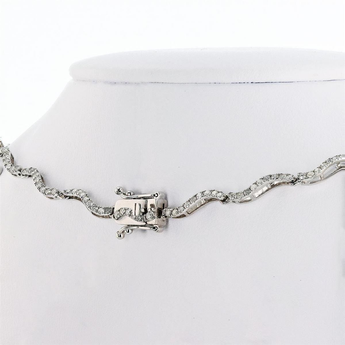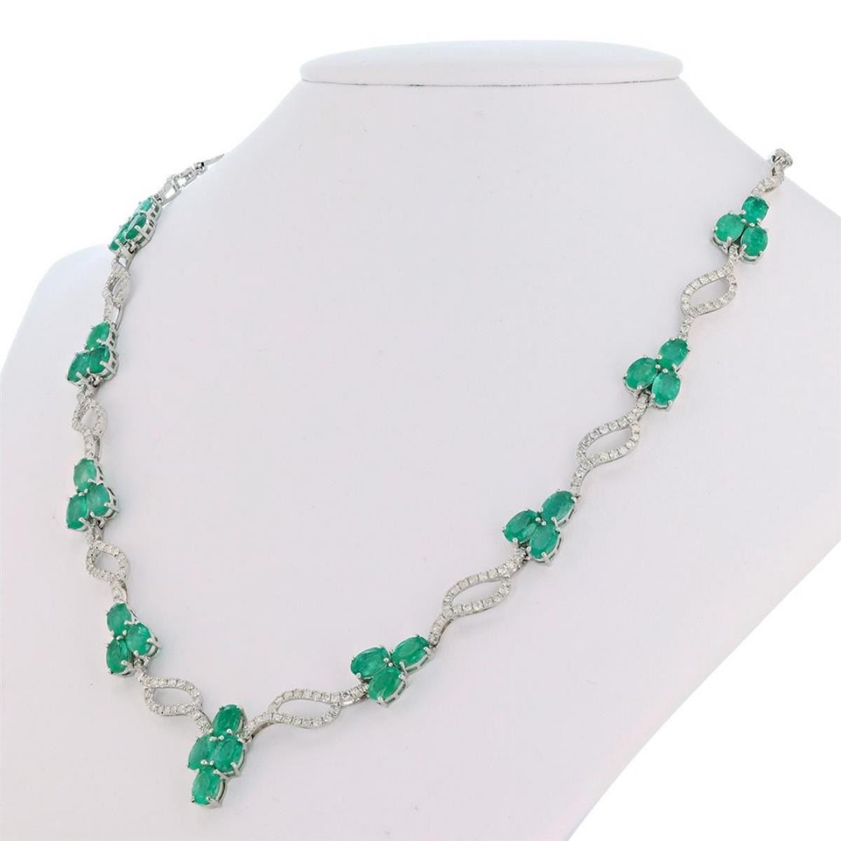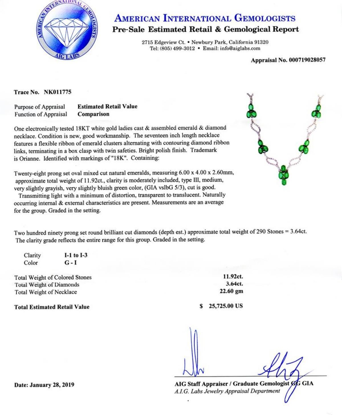 One electronically tested 18KT white gold ladies cast and assembled emerald and diamond necklace. Condition is new, good workmanship. The seventeen inch length necklace features a flexible ribbon of emerald clusters alternating with contouring diamond ribbon links, terminating in a box clasp with twin safeties. Bright polish finish. Trademark is Orianne. Identified with markings of "18K". Containing: Twenty-eight prong set oval mixed cut natural emeralds, measuring 6.00 x 4.00 x 2.60mm, approximate total weight of 11.92ct., clarity is moderately included, type III, medium, very slightly grayish, very slightly bluish green color, (GIA vslbG 5/3), cut is good. Transmitting light with a minimum of distortion, transparent to translucent. Naturally occurring internal and external characteristics are present. Measurements are an average for the group. Graded in the setting. Two hundred ninety prong set round brilliant cut diamonds (depth est.) approximate total weight of 290 Stones = 3.64ct. The clarity grade reflects the entire range for this group. Graded in the setting. Clarity I-1 to I-3 Color G-I Total Weight of Colored Stones 11.92ct. Total Weight of Diamonds 3.64ct. Total Weight of Necklace 22.60 gm