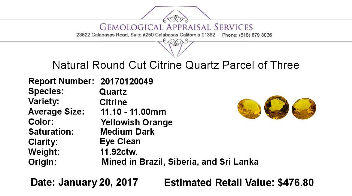 One natural round cut citrine quartz parcel of three with an exact weight of 11.92ctw., clarity is eye clean, yellowish orange, medium dark. Gemological Appraisals Services estimates the retail value at $476.8 GAS Appraised.
