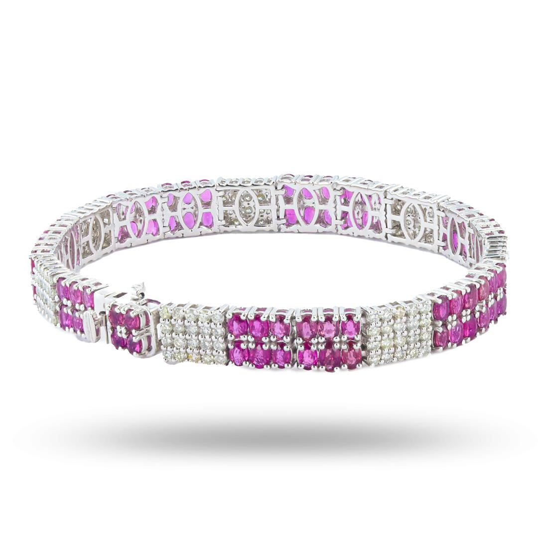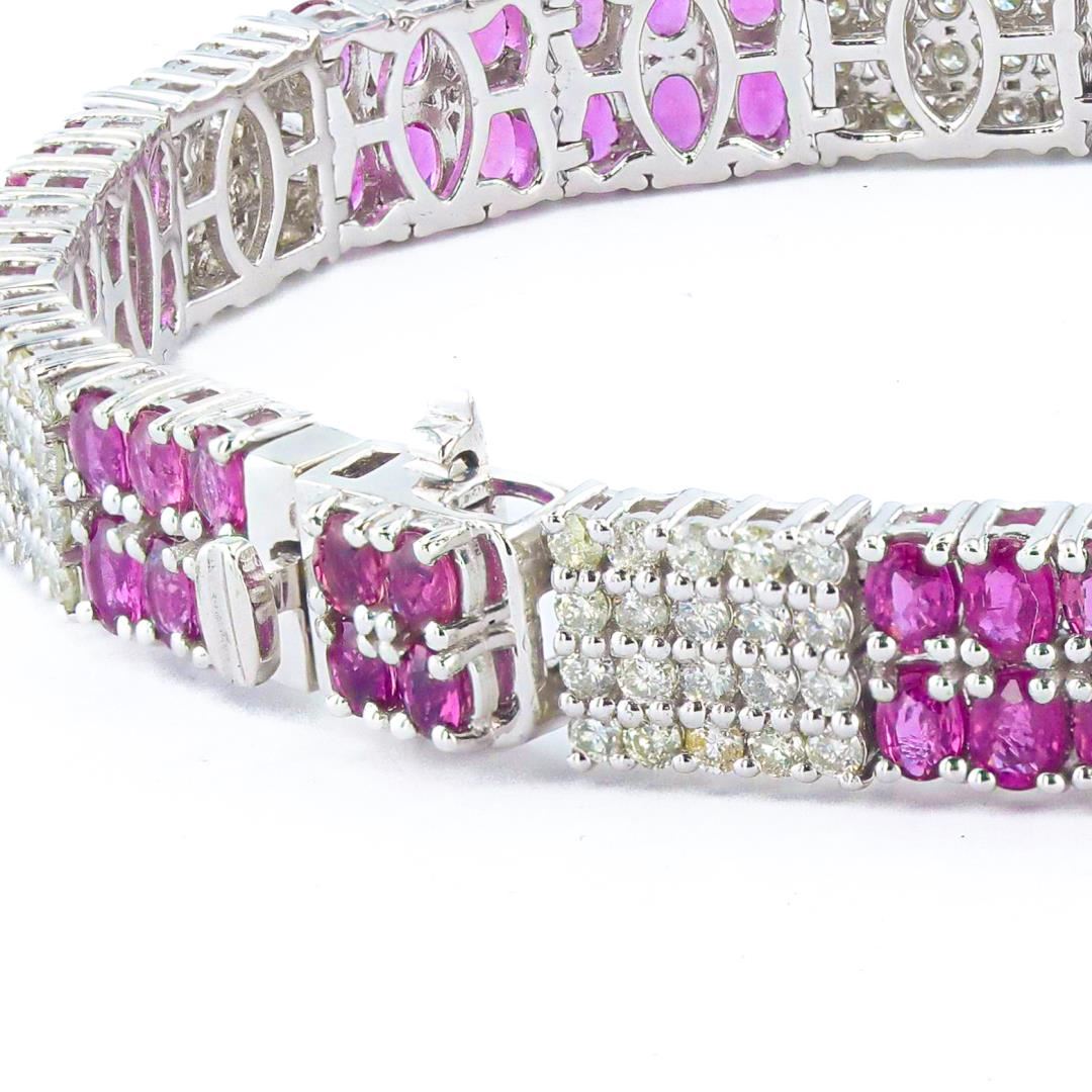 One polished, stamped. and tested platinum bracelet marked Oscar Friedman. The bracelet is mounted with: 82 genuine oval shaped rubies weighing approximately 11.92 carats, and 140 genuine round diamonds weighing approximately 2.72 carats. The bracelet measures 7 inches in length and is finished with a tension lock clasp and folding safety clasp. This item weighs 33.2 grams, condition is new, excellent workmanship. #MAIN GEMSTONES# Species: Natural Corundum; Variety: Ruby; Shape: Oval; Cutting Style: Brilliant Cut Crown, Step Cut Pavilion; Quantity: 82 Rubies; Average Dimensions: 3.5 x 2.5mm; Total Weight: 11.92 carats; Color: Red; Cut Grade: Good - Very Good; Refractive Index: 1.762 - 1.770 DR; Hardness: 9 #ADJACENT GEMSTONES ON BRACELET# Identity: Natural Diamond; Shape: Round; Cutting Style: Brilliant Cut; Quantity: 140 Diamonds; Average Diameter: 1.7mm; Total Weight: 2.72 carats; Clarity Grade: VS2-SI2; Color Grade: H-I; Refractive Index: 2.417; Hardness: 10; TOTAL RUBY WEIGHT: 11.92 cts; TOTAL DIAMOND WEIGHT: 2.72 cts; WEIGHT OF ITEM: 33.2 grams; METAL: Platinum #Size: 7