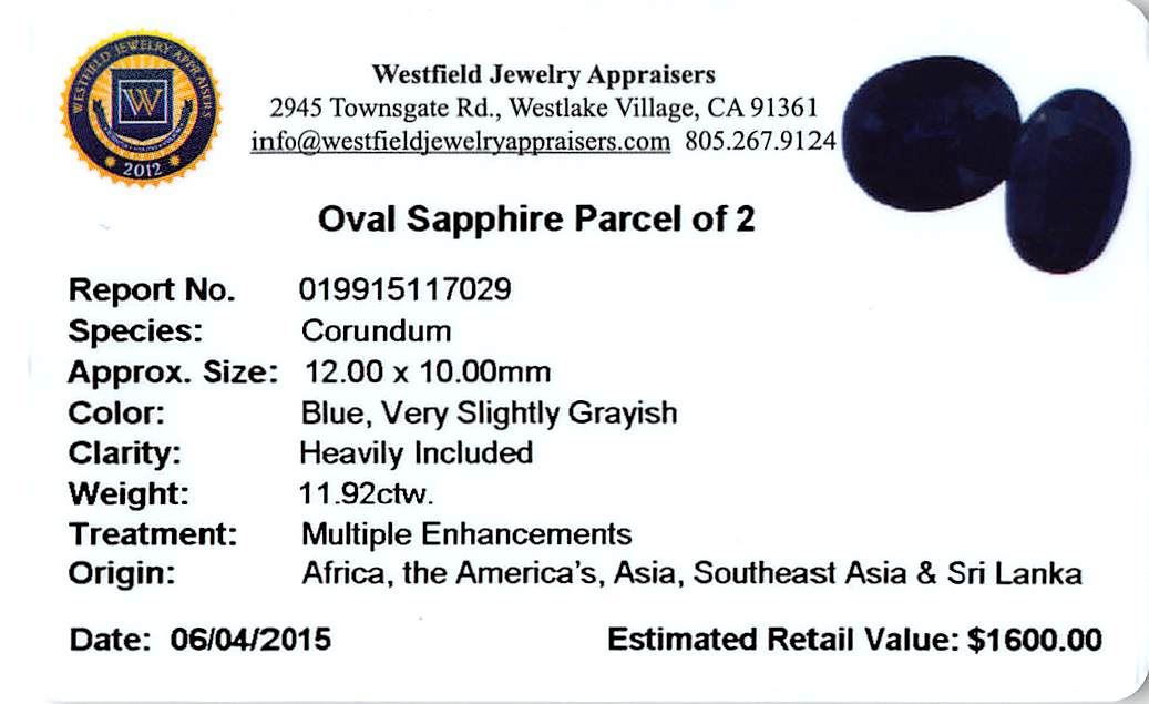 Two oval mixed cut natural blue sapphires, measuring 12.00 x 10.00 x 6.00mm, exact total weight 11.92ct., clarity is heavily included, type II, very dark, very slightly grayish, blue color, (GIA B 8/3), cut is good. Measurements are an average for the pair. Transmitting light very diffusely, opaque. Naturally occurring internal & external characteristics are present. Indications of multiple laboratory enhancements, including high temperature heat treatment. Westfield Appraised at $1,600.00.