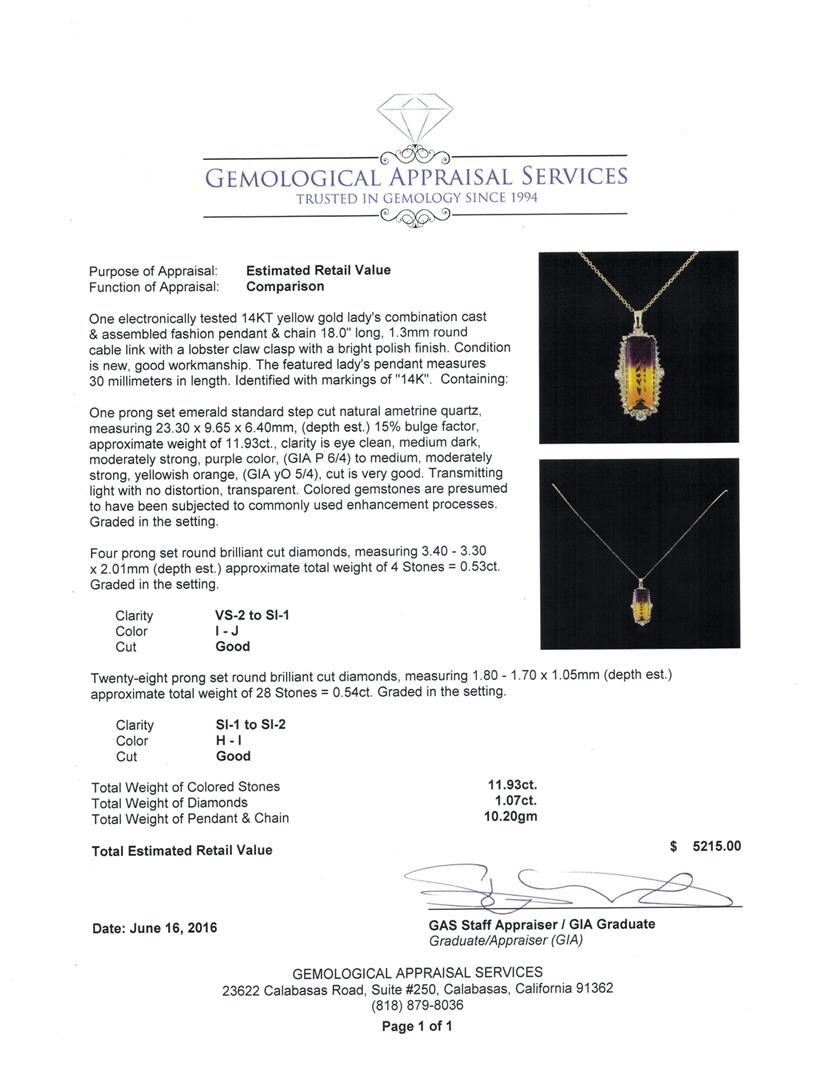 One electronically tested 14KT yellow gold lady's combination cast & assembled fashion pendant & chain 18.0" long, 1.3mm round cable link with a lobster claw clasp with a bright polish finish. The featured lady's pendant measures 30 millimeters in length. Identified with markings of "14K". Condition is new, good workmanship. Containing: One prong set emerald standard step cut natural ametrine quartz, measuring 23.30 x 9.65 x 6.40mm, (depth est.) 15%. bulge factor, approximate weight of 11.93ct., clarity is eye clean, medium dark, moderately strong, purple color, (GIA P 6/4) to medium, moderately strong, yellowish orange, (GIA yO 5/4), cut is very good. Transmitting light with no distortion, transparent. Colored gemstones are presumed to have been subjected to commonly used enhancement processes. Graded in the setting. Four prong set round brilliant cut diamonds, measuring 3.40 - 3.30 x 2.01mm (depth est.) approximate total weight of 4 Stones = 0.53ct. Graded in the setting. Clarity: VS-2 to SI-1. Color: I - Good Twenty-Eight prong set round brilliant cut diamonds, measuring 1.80 - 1.70 x 1.05mm (depth est.) approximate total weight of 28 Stones = 0.54ct. Graded in the setting. Clarity: SI-1 to SI-2. Color: H - I. Cut Good. Total Weight of Colored Stones 11.93ct. Total Weight of Diamonds 1.07ct. Total Weight of Pendant & Chain 10.20gm GAS Appraised at $5,215.00.
