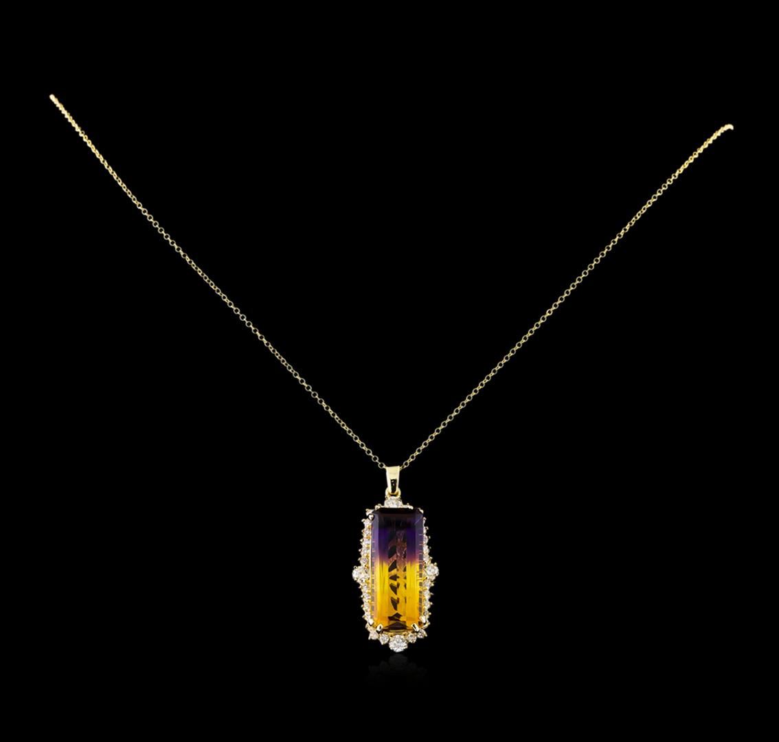 One electronically tested 14KT yellow gold lady's combination cast & assembled fashion pendant & chain 18.0" long, 1.3mm round cable link with a lobster claw clasp with a bright polish finish. The featured lady's pendant measures 30 millimeters in length. Identified with markings of "14K". Condition is new, good workmanship. Containing: One prong set emerald standard step cut natural ametrine quartz, measuring 23.30 x 9.65 x 6.40mm, (depth est.) 15%. bulge factor, approximate weight of 11.93ct., clarity is eye clean, medium dark, moderately strong, purple color, (GIA P 6/4) to medium, moderately strong, yellowish orange, (GIA yO 5/4), cut is very good. Transmitting light with no distortion, transparent. Colored gemstones are presumed to have been subjected to commonly used enhancement processes. Graded in the setting. Four prong set round brilliant cut diamonds, measuring 3.40 - 3.30 x 2.01mm (depth est.) approximate total weight of 4 Stones = 0.53ct. Graded in the setting. Clarity: VS-2 to SI-1. Color: I - Good Twenty-Eight prong set round brilliant cut diamonds, measuring 1.80 - 1.70 x 1.05mm (depth est.) approximate total weight of 28 Stones = 0.54ct. Graded in the setting. Clarity: SI-1 to SI-2. Color: H - I. Cut Good. Total Weight of Colored Stones 11.93ct. Total Weight of Diamonds 1.07ct. Total Weight of Pendant & Chain 10.20gm GAS Appraised at $5,215.00.