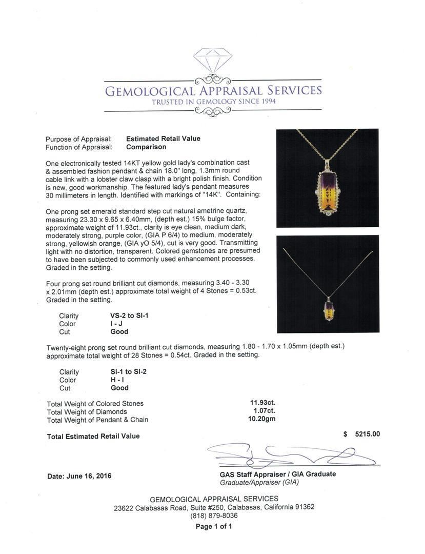 One electronically tested 14KT yellow gold lady's combination cast & assembled fashion pendant & chain 18.0" long, 1.3mm round cable link with a lobster claw clasp with a bright polish finish. The featured lady's pendant measures 30 millimeters in length. Identified with markings of "14K". Condition is new, good workmanship. Containing: One prong set emerald standard step cut natural ametrine quartz, measuring 23.30 x 9.65 x 6.40mm, (depth est.) 15%. bulge factor, approximate weight of 11.93ct., clarity is eye clean, medium dark, moderately strong, purple color, (GIA P 6/4) to medium, moderately strong, yellowish orange, (GIA yO 5/4), cut is very good. Transmitting light with no distortion, transparent. Colored gemstones are presumed to have been subjected to commonly used enhancement processes. Graded in the setting. Four prong set round brilliant cut diamonds, measuring 3.40 - 3.30 x 2.01mm (depth est.) approximate total weight of 4 Stones = 0.53ct. Graded in the setting. Clarity: VS-2 to SI-1. Color: I -  Good Twenty-Eight prong set round brilliant cut diamonds, measuring 1.80 - 1.70 x 1.05mm (depth est.) approximate total weight of 28 Stones = 0.54ct. Graded in the setting. Clarity: SI-1 to SI-2. Color: H - I. Cut Good. Total Weight of Colored Stones 11.93ct. Total Weight of Diamonds 1.07ct. Total Weight of Pendant & Chain 10.20gm GAS Appraised.