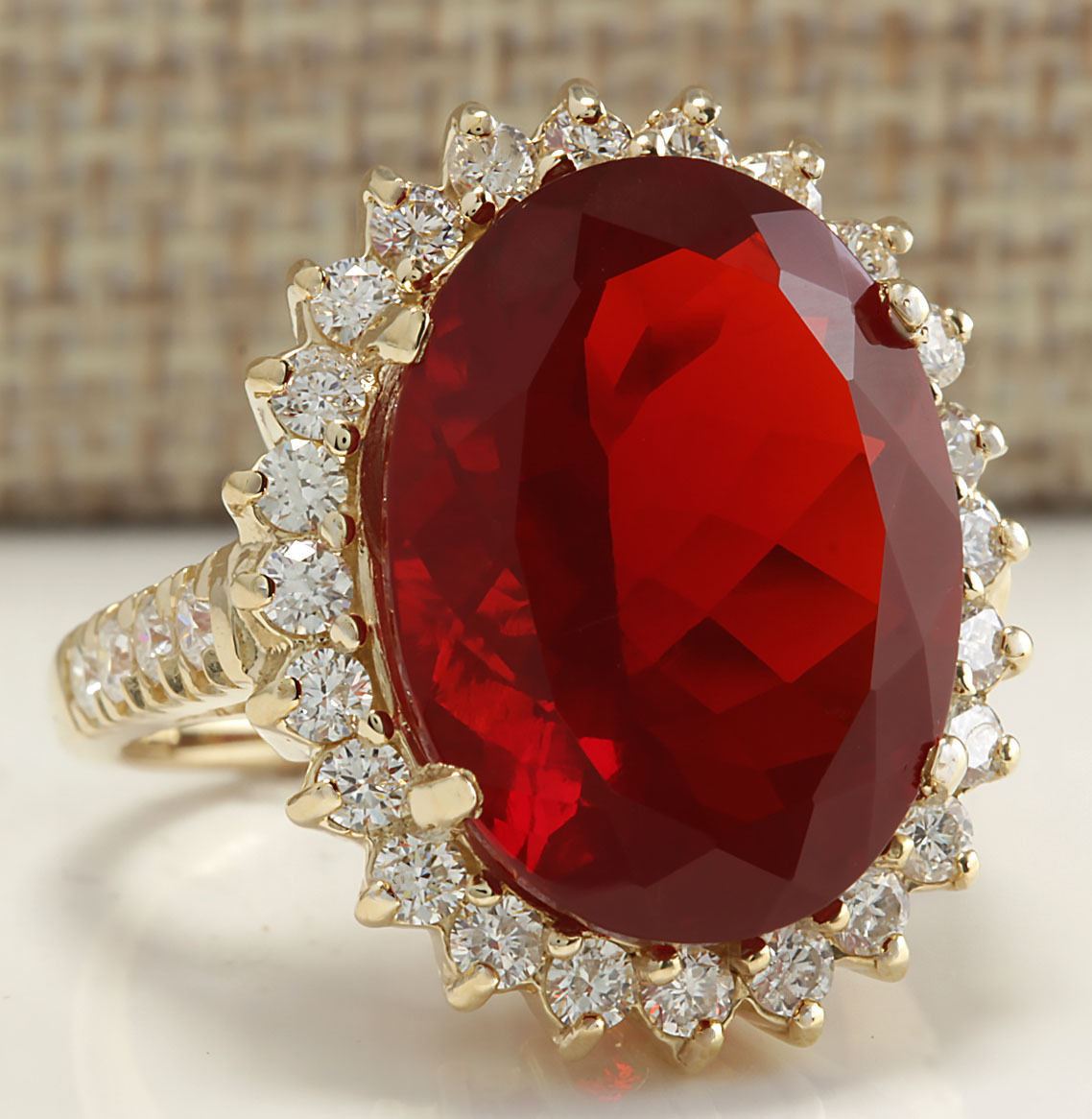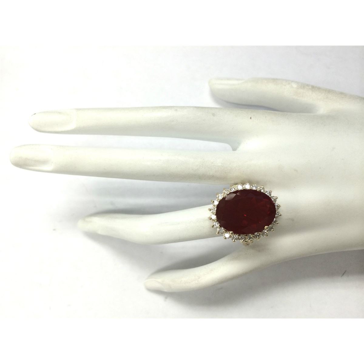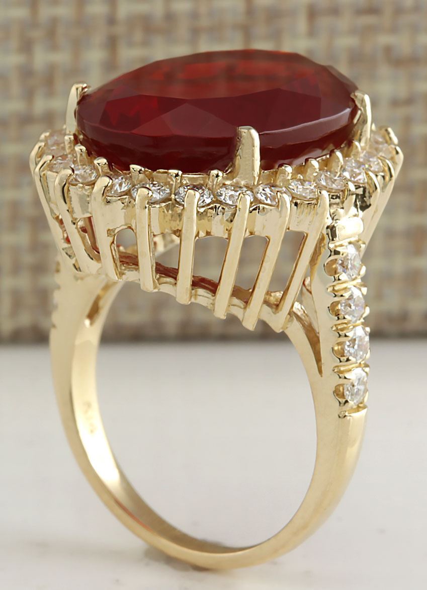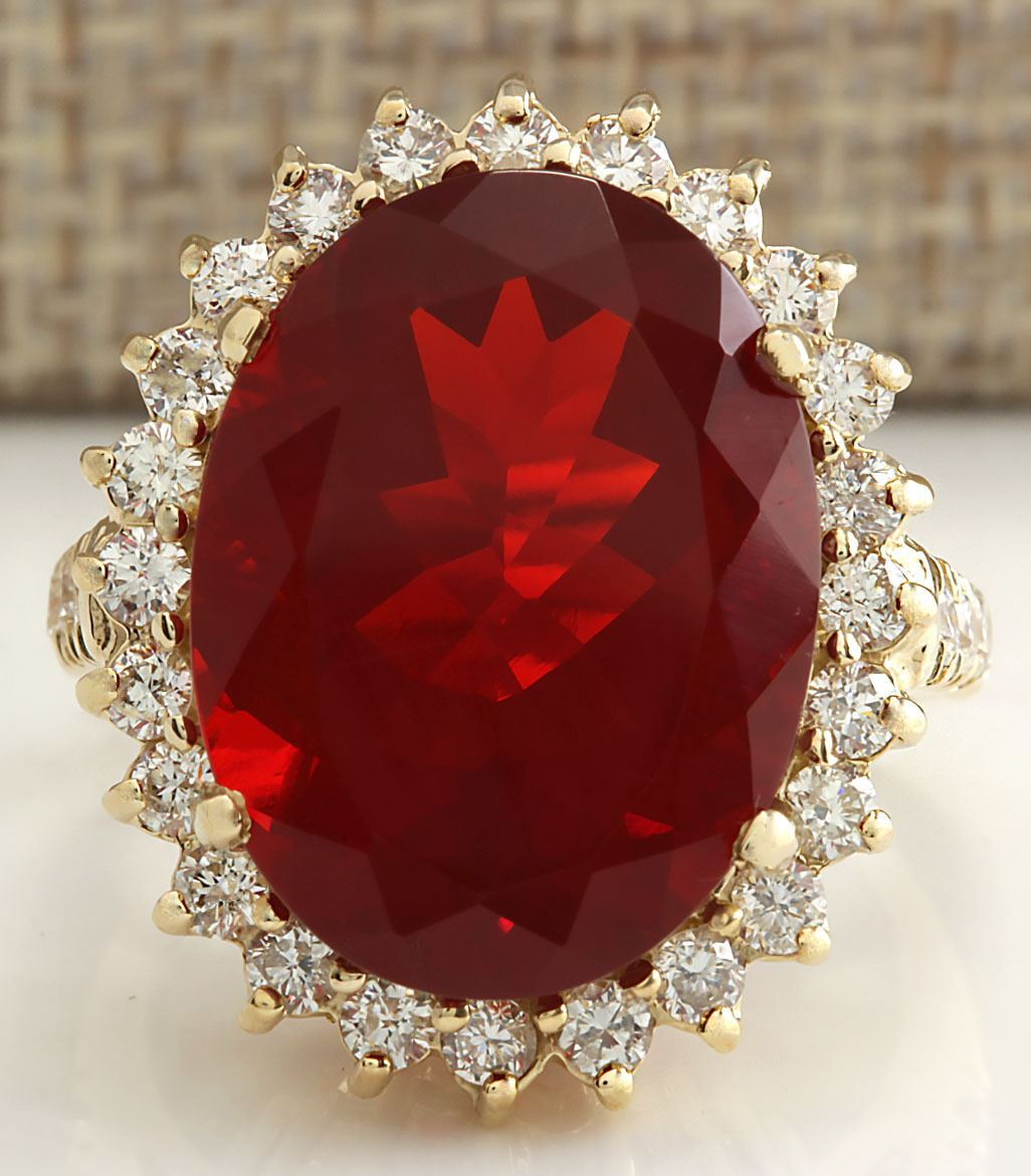Stamped: 14K Ring Size: 6.75 Total Ring Weight: 10 Grams Diamond Weight: Total natural diamond weight is 1.30carat. SI1-SI2 clarity / G-H color Gemstone Weight: Total Natural Fire Opal Weight is 10.63 ctw (Measures: 18.17x13.70mm) VVS Face Measures: 23.23x19.09mm Main stone color: Red [SKU:703112]
