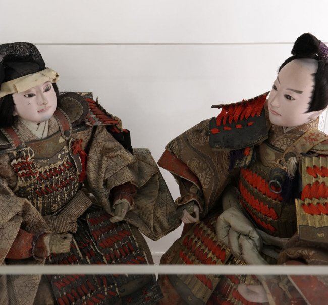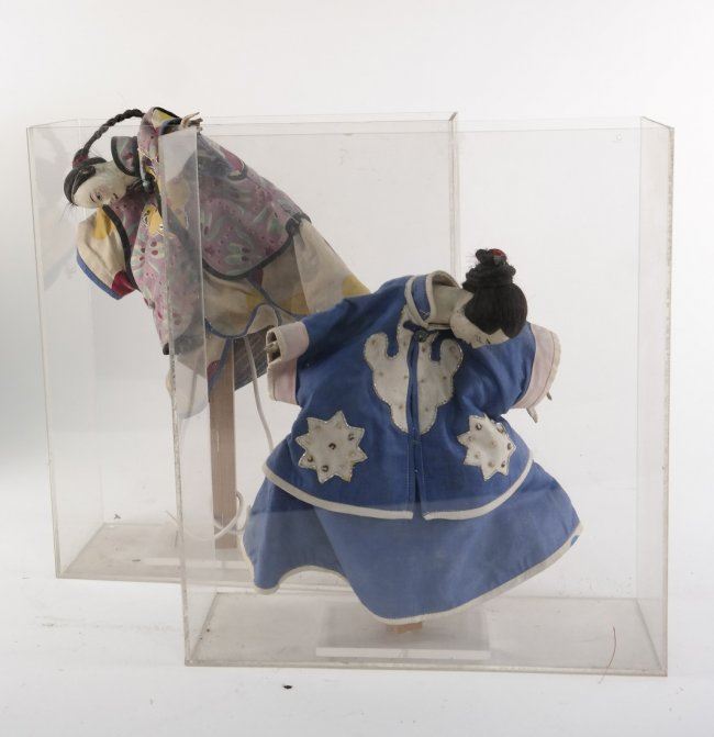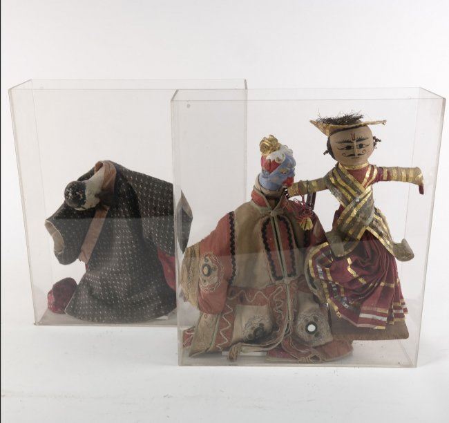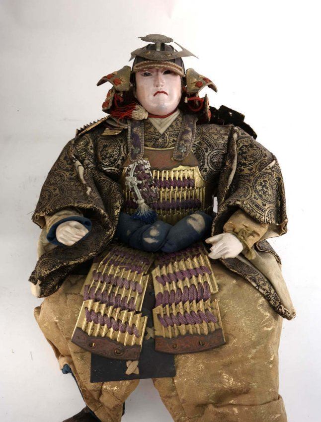7 Japanese dolls, 2 Samurai warriors [Approx: 16"H x 11" W]. Wear and distress appropriate with age. 2 South East Asian Dolls [Approx: 11" H x 7 1/2" W]. Distress to dolls face and hands. 3 Japanese dolls. [Tallest: 17"H]. Distress and chips to paint and hands. Sold as is.