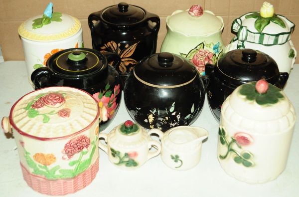 9 Cookie Jars, 1 Creamer/Sugar Set. Some marked USA and Japan.