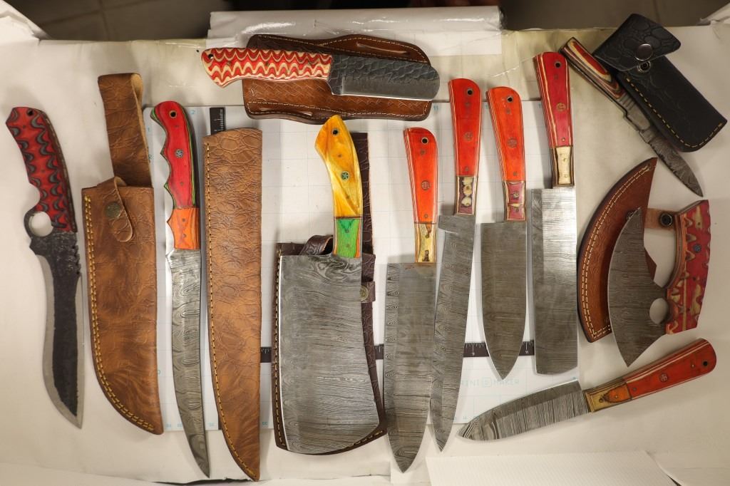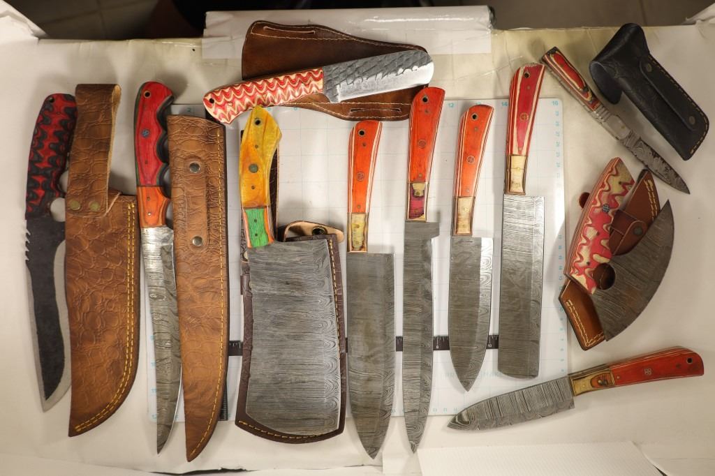 STEEL. 6 HAVE LEATHER SHEATHS. 1-7.5" FOLDING POCKET KNIFE, 5.34" CHOPPING KNIFE, 8.25" COWBOY CUTTER, 11.75" BUTCHER KNIFE, 12" KNIFE, 13.75" KNIFE. THE REST DO NOT HAVE LEATHER SHEATHS: 9.75'', 10.75", 11.75",