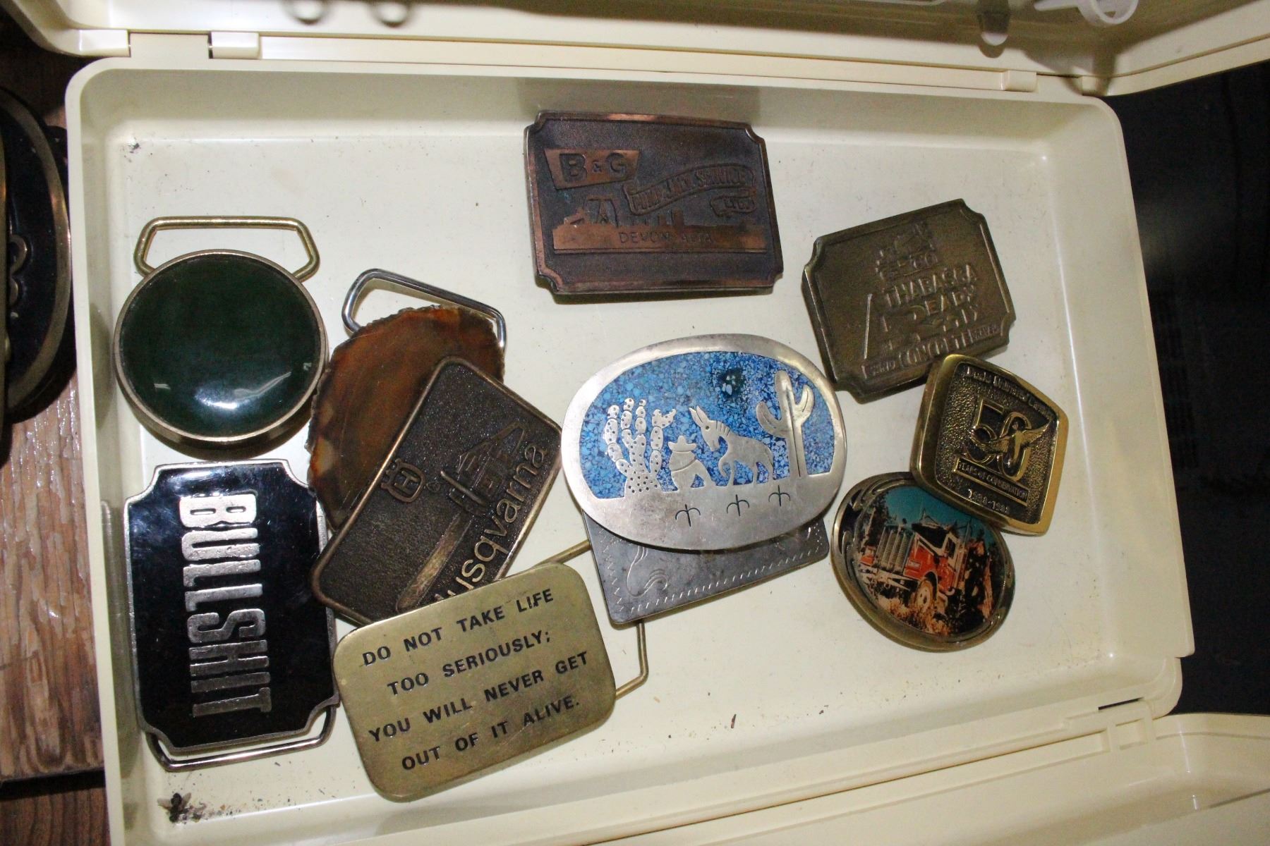 11 Belt Buckles in an Estee Lauder Cosmetics Case