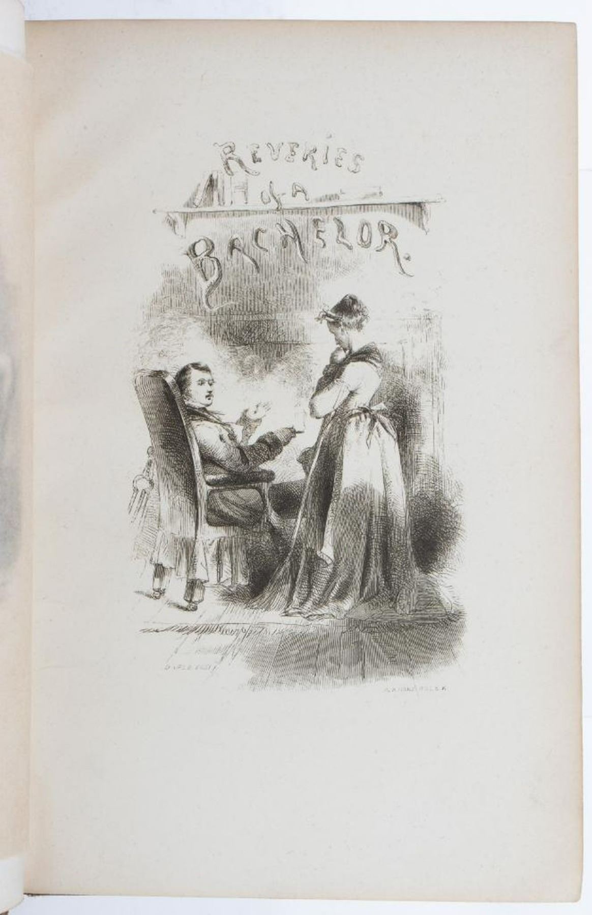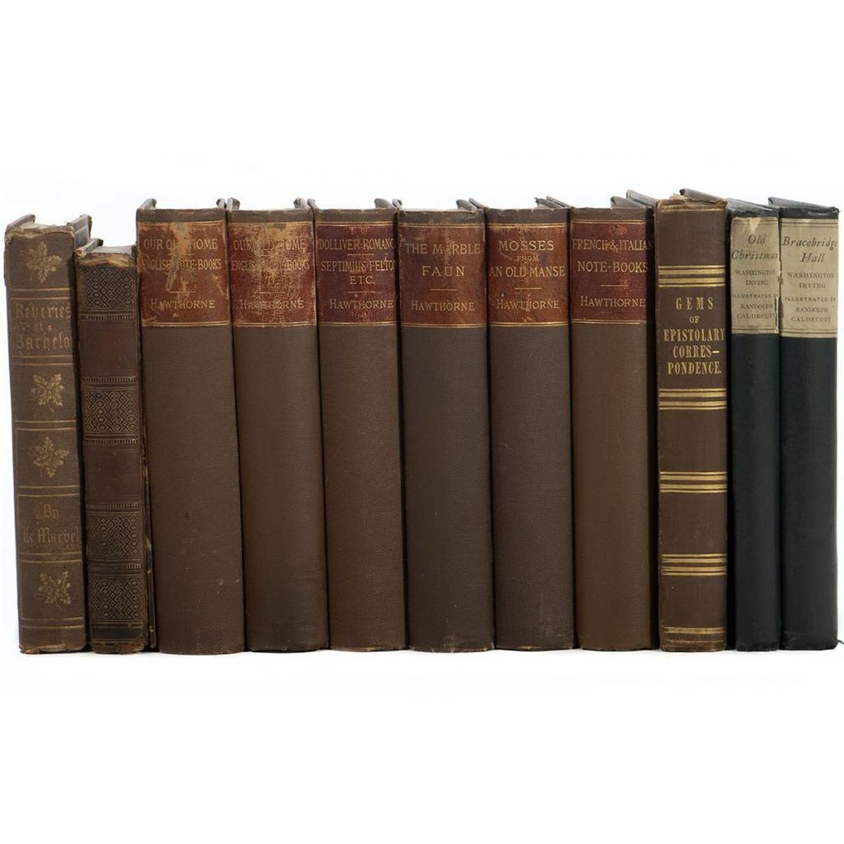 Lot of 11 books of Literature and Belles-Lettres: 1. ARISTOPHANES [HICKIE, WILLIAM JAMES]. The Comedies of Aristophanes. A New and Literal Translation, from the Revised Text of Dindorf, with Notes and Extracts from the Best Metrical Versions. Vol. I: The Acharnians, Knights, Clouds, Wasps, Peace, and Birds. London: Henry G. Bohn, 1853. 12mo. Half calf and marbled boards, gilt embossed spine, all edges marbled, marbled endpapers. Engraved illustration frontispiece. Fair. Rubbed, losses to spine and splitting at front hinges, corner leather worn. Pencil marks to flyleaf, small dampstains to top and bottom of frontispiece, pages are clean. 2. MITCHELL, DONALD GRANT [Ik MARVEL]. WITH ALS. Reveries of a Bachelor, or, a Book of the Heart. New York: Baker & Scribner, 1850. With tipped-in signed letter from the author, dated 1873. 12mo. Original brown cloth with gilt acorn branch surrounded by blindstamped border decoration on front and back, gilt to spine. Fair to Good. Fading, slight losses to cloth at head and foot of spine, corners bumped and worn, bookplate on front pastedown, dampstaining to bottom corner of pages, starting at about page 107 and continuing to the back endpaper. Binding is loose at about the center, with two pages coming detached and having ink stains. 3. WILLMOTT, ROBERT ARIS. Gems of Epistolary Correspondence; Selected from the Best English Authors, from the Time of Sir Philip Sidney to the Present Day. London: Henry G. Bohn, 1846. 8vo. Original brown blindstamped decorated cloth, gilt to spine. Fair to Good. Rubbing to cover, corners bumped and worn, foxing/toning mostly to front pages, binding loose towards the back, there is some warping of the pages. 4. IRVING, WASHINGTON. Bracebridge Hall. London: Macmillan & Co., 1887. Illustrated throughout by R. Caldecott; illustrated title page and frontispiece. 12mo. Original dark green cloth, paper label on spine. Very Good. Only light wear, toning, previous owner's bookplate on pastedown. 5. IRVING, WASHINGTON. Old Christmas from the Sketchbook of Washington Irving. London: Macmillann & Co., 1892. Illustrated throughout by R. Caldecott; illustrated title page and frontispiece. 12mo. Original dark green cloth, paper label on spine. Very Good. Only light wear, toning, previous owner's bookplate on pastedown. 6.-11. HAWTHORNE, NATHANIEL. Six volumes: Our Old Home and English Note-Books, Vol. I; Our Old Home, and English Note-Books, Vol. II; The Dolliver Romance, Fanshawe, and Septimus Felton, with an Appendix Containing The Ancestral Footsteps; The Marble Faun, or The Romance of Monte Beni; Mosses from an Old Manse; Passages from the French and Italian Note-Books. Incomplete set uniformly bound volumes, Boston and New York: Houghton, Mifflin and Company; Cambridge: The Riverside Press, Cambridge, 1883-1887. Original brown cloth with gilt red leather labels on spines, gray endpapers, each with engraved illustration frontispiece. All are in good condition. Light wear and discoloring to the cloth, a few stains and marks, rubbing to the leather labels, but overall they look good.