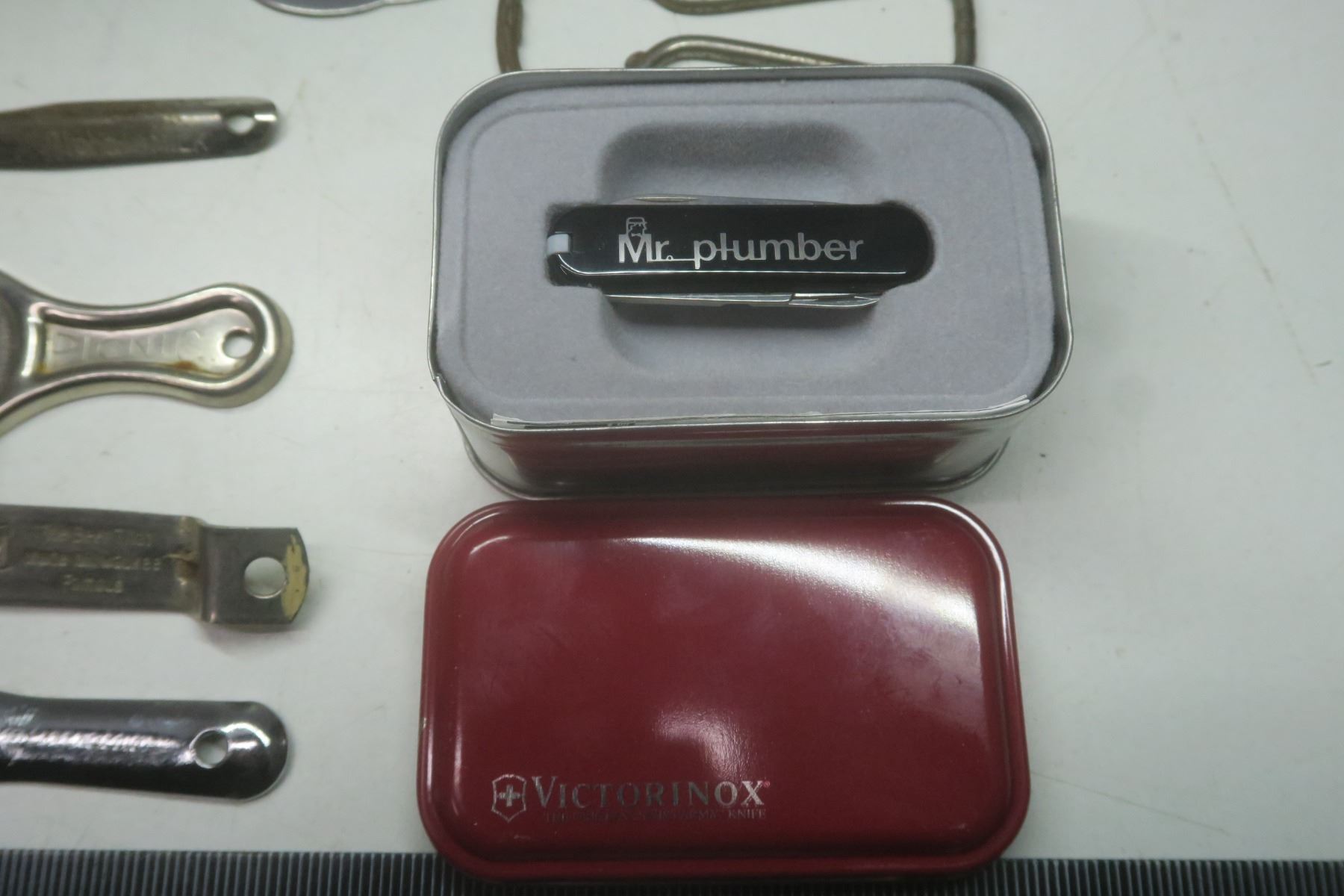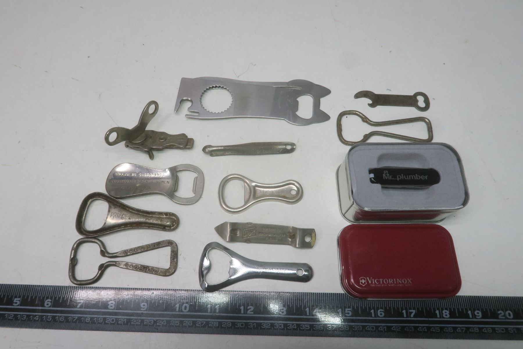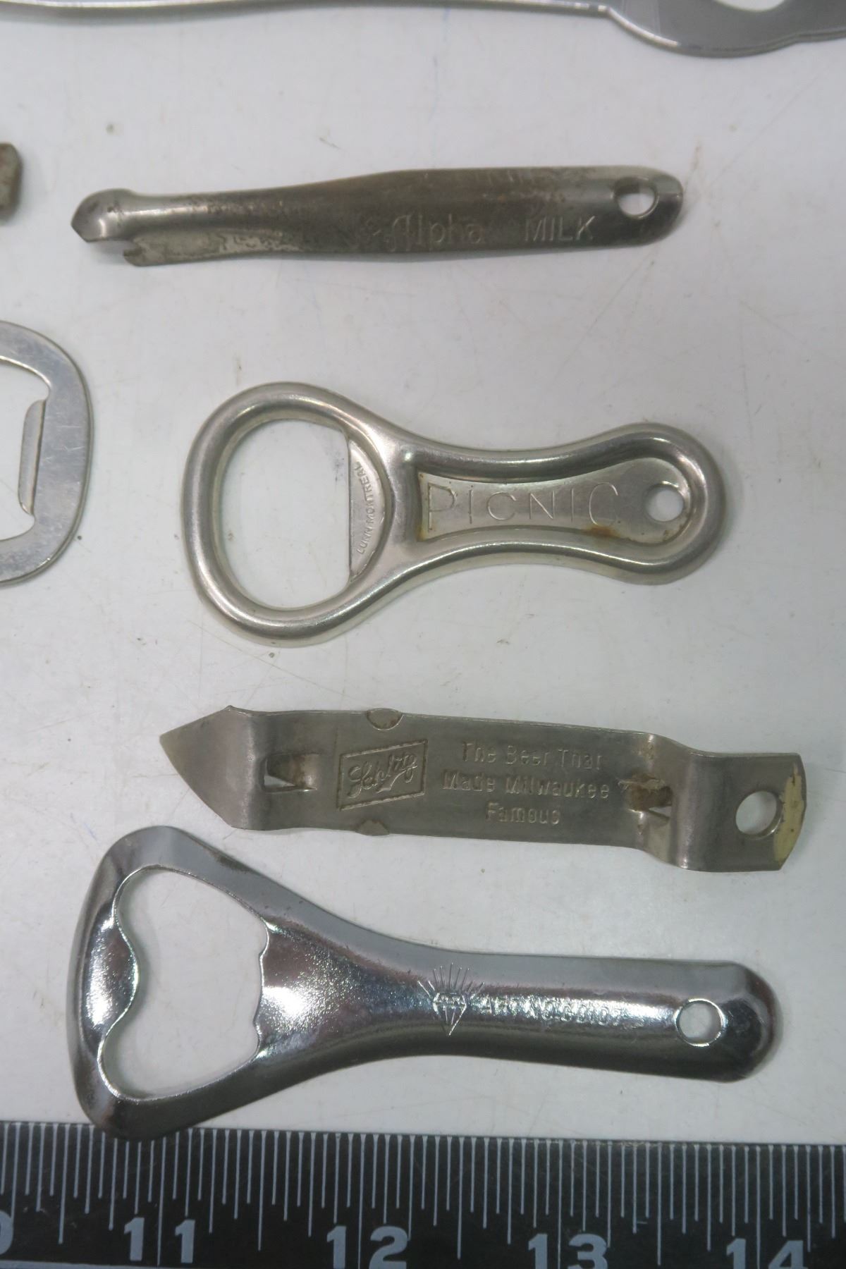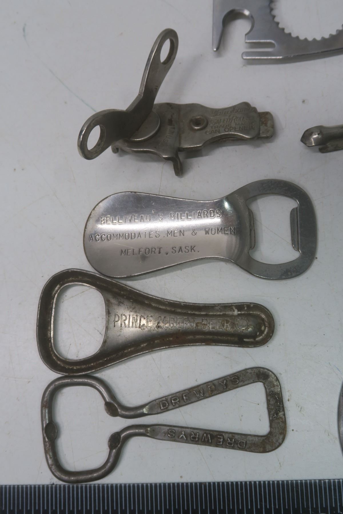 11 Bottle Openers - "Prince Albert Beer", "Belliveau's Billards", "Schlitz Beer" + Swiss army Knife