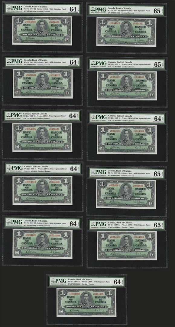 One (11) Consecutive 1937 $1 Bank of Canada Notes PMG 64EPQ & 65EPQ. PMG Certified.