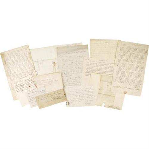 <B>Group of Eleven Early 19th Century Business Letters and Documents,</B></I> as follows:<BR>ANS, "<I>Wm. Gray</B></I>", one page, 7.25" x 5.5", Salem, Massachusetts, November 5, 1800, to a Thomas K. Jones, n.p. Regards insuring a voyage to various ports along the coast of the Indian subcontinent. Fine condition. <BR>ALS, "<I>Eben Stoker</B></I>", one page with address panel, 7" x 9.5", Newburyport, Massachusetts, July 24, 1802, to Charles Neil, Portsmouth. Note accompanying a bill. Fine condition.<BR>Postage receipt, one page, 7.25" x 4.5", n.p., January 1, 1809. Uneven edges, very fine condition.<BR>ALS, "<I>Russell Glavens</B></I>", two pages with second address sheet, 8" x 10", Philadelphia, Pennsylvania, November 8, 1809, to Nathaniel Cushing, Boston, Massachusetts. A captain describes his ship and crew. Aging, good condition.<BR>ALS, "<I>H Niles</B></I>", one page, 8" x 13.25", Baltimore, Maryland, July 1, 1811, to a Mr. Bently, Salem, Massachusetts. Niles, an early American journalist and publisher, discusses setting up his short-lived "<I>Weekly Register.</B></I> Stains, good condition.<BR>ALS, "<I>Thomas Gold</B></I>", one page with address panel, 8" x 9.75", Pittsfield, Massachusetts, April 2, 1812, to Garry Bacon, Woodbury, Connecticut, advising of a real estate offer. Stains, very good condition.<BR>ALS, "<I>Tim. Walker</B></I>", one page with address panel, 5.75" x 7.5", Charlestown, Massachusetts, June 8, 1814, to Edward Cuth, Portsmouth, New Hampshire, regarding debt settlement. Fine condition.<BR>Stagecoach receipt, 7.5" x 3.5", Virginia, December 8, 1814. Browning, fine condition.<BR> Tavern bill to a Colonel Kingsberry, 5.25" x 4.25", n.p., n.d. Very fine condition.<BR>DS, "<I>Alpheus Babcock</B></I>" and "<I>John G. Klemm</B></I>", 2 1/2 pages, 7.75" x 13", Philadelphia, Pennsylvania, October 3, 1829. A business agreement regarding the manufacture of pianofortes. Light stains, small splits, fine condition.<BR> ALS, "<I>H.D. Rice</B></I>", one page with address panel, 8" x 12.75", London, England, to J. Randall, Philadelphia. Warns that England is preparing for war against the United States! Stains, fine condition. <I>From the collection of Henry E. Luhrs.</B></I><BR><BR><b>Shipping:</b> Flat Material, Small (<a target="_blank" href="http://www.heritageauctions.com/common/shipping.php">view shipping information</a>)