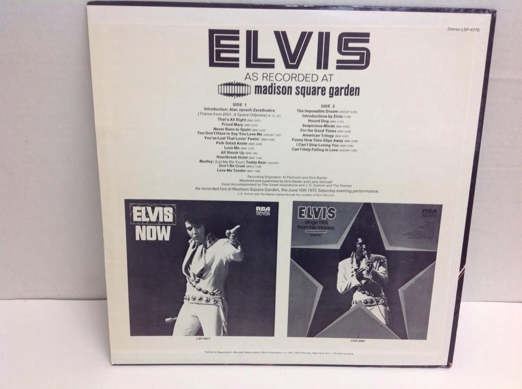 RCA LSP 3893; Clambake, with copy of Elvis and Priscilla wedding picture in NM condition; Grade VG/ VG, RCA LSP3921; Elvis Golden Records Volume 4; Grade VG /VVG+, RCA LSP 3989; Speedway; Grade VG / VG++, RCA LPM 4088; Elvis Original Soundtrack from TV Special; Grade VG / VG + +, RCA LSP 4155; From Elvis in Memphis; Grade VG/ VG ++, RCA LSP 4362; On Stage February 1970; Grade VG + / M - -, RCA CPL 1 4395; Memories of Christmas (no greeting card); Grade M - -/ M - -, RCA LSP 4445; That's The Way It Is; Grade M - - / M - -, RCA AN l 1 1936; The Wonderful World of Christmas; Grade VG = + / M - -, RCA 4460, LSP; Elvis Country with photo (NM); Grade VG / VG +, RCA 4776, LSP; Elvis as Recorded at Madison Square Garden; Grade VG+ / M - -.