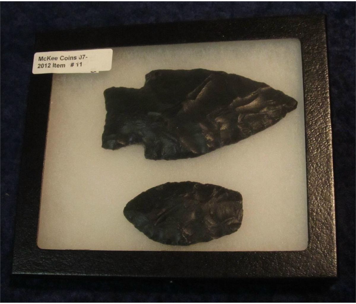 11. Flint Knappers Special. (2) Indian Relics chipped from Black Obsidian. One is a fluted Clovis type. All displayed in a glass faced show case.