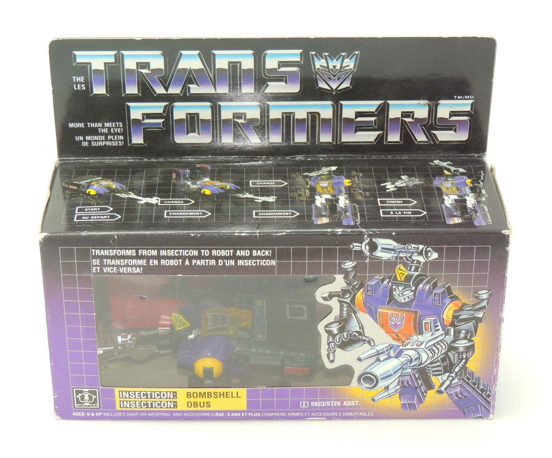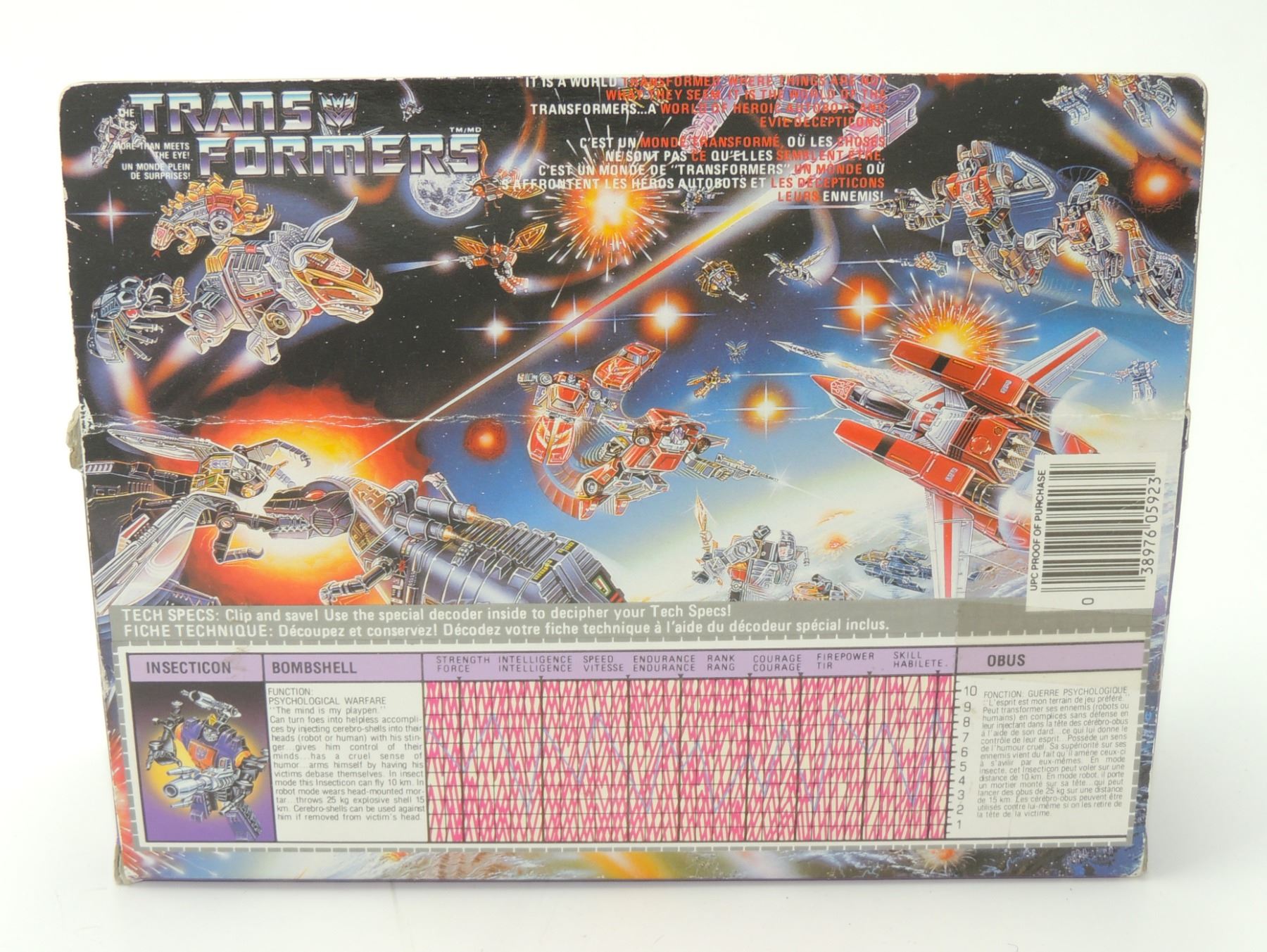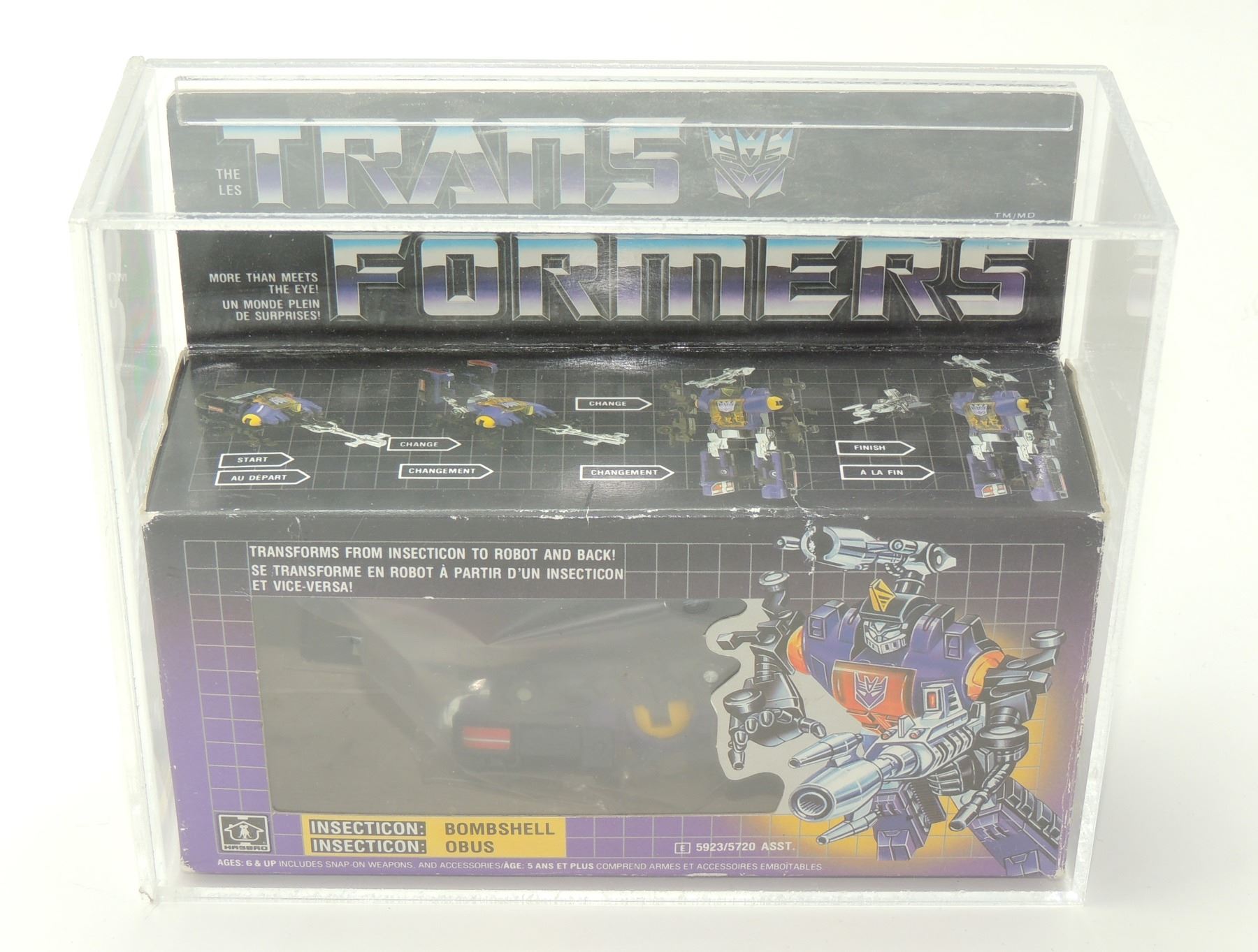 DECEPTICON INSECTICON BOMBSHELL CIB COMPLETE WITH BOX INSTRUCTIONS PARTS, INCLUDES CUSTOM PROTECTIVE ACRYLIC CASE TRANSFORMERS ROBOTS IN DISGUISE TAKARA HASBRO VINTAGE TOY