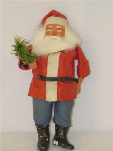 11" GERMAN SANTA PAPIER MACHE 2 PC. CANDY CONTAINER W/ FELT JACKET & PANTS - LOSSES & IMPERFECTIONS