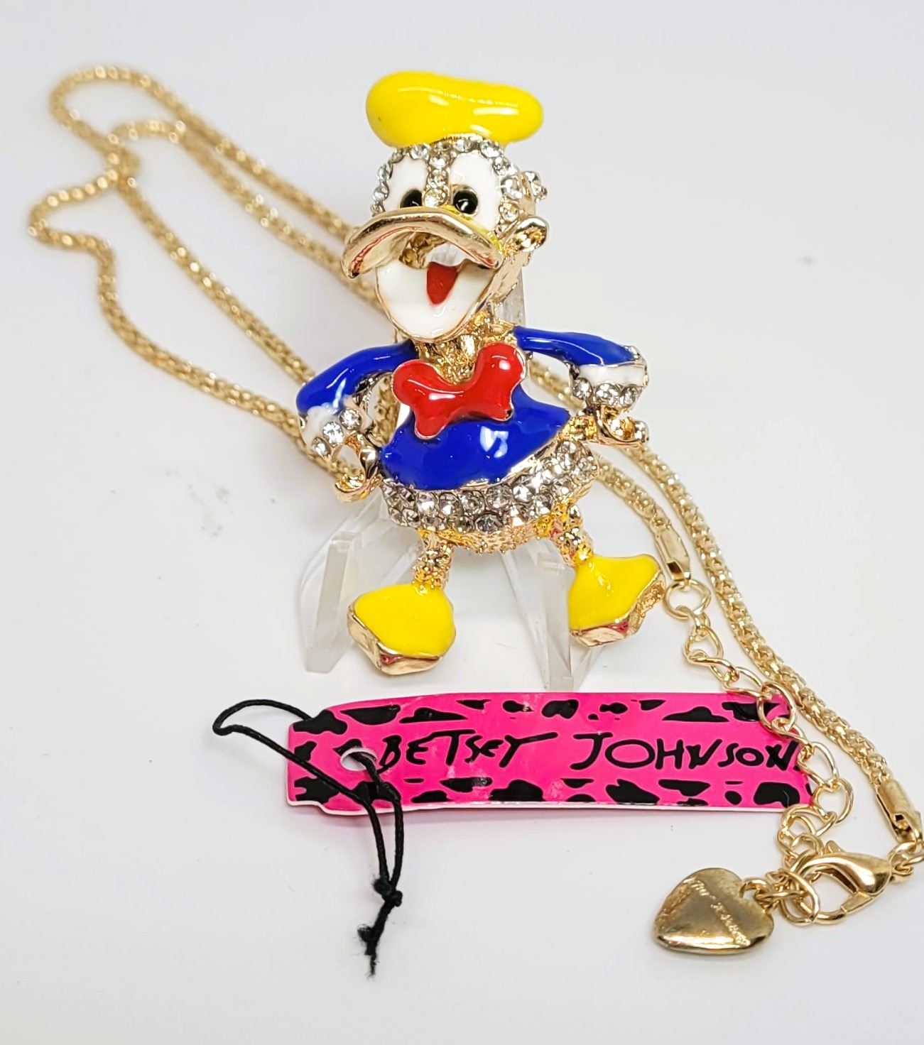 YELLOW , BLUE AND RED ENAMEL HAPPY DUCK PENDANT ON 20" CHAIN WITH 2" EXTENDER. JEWELRY. JEWELRY