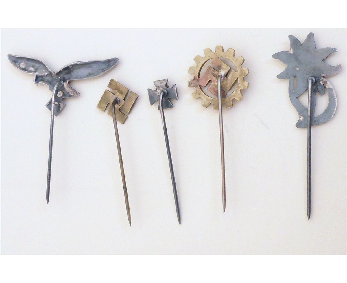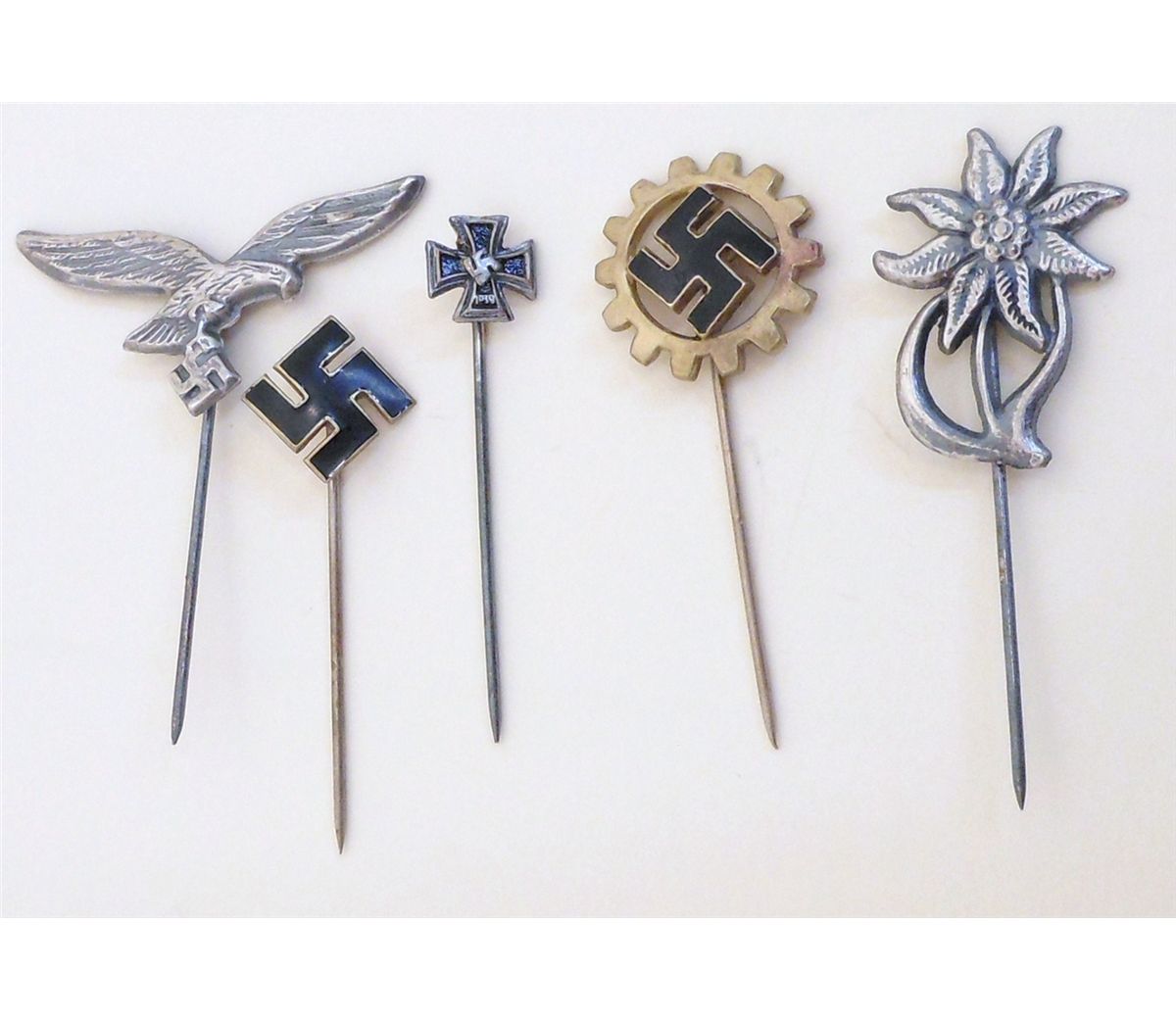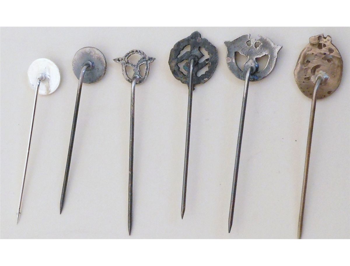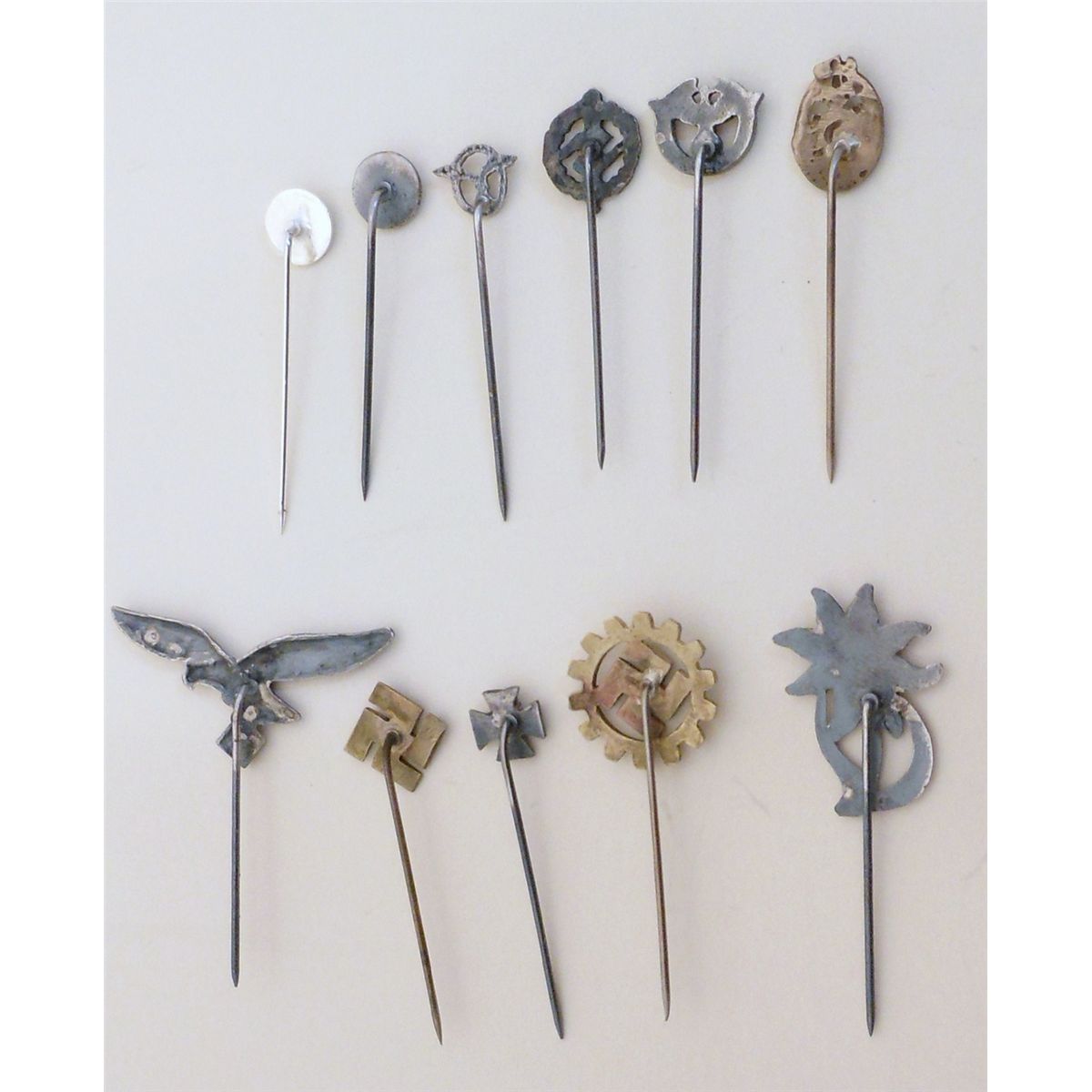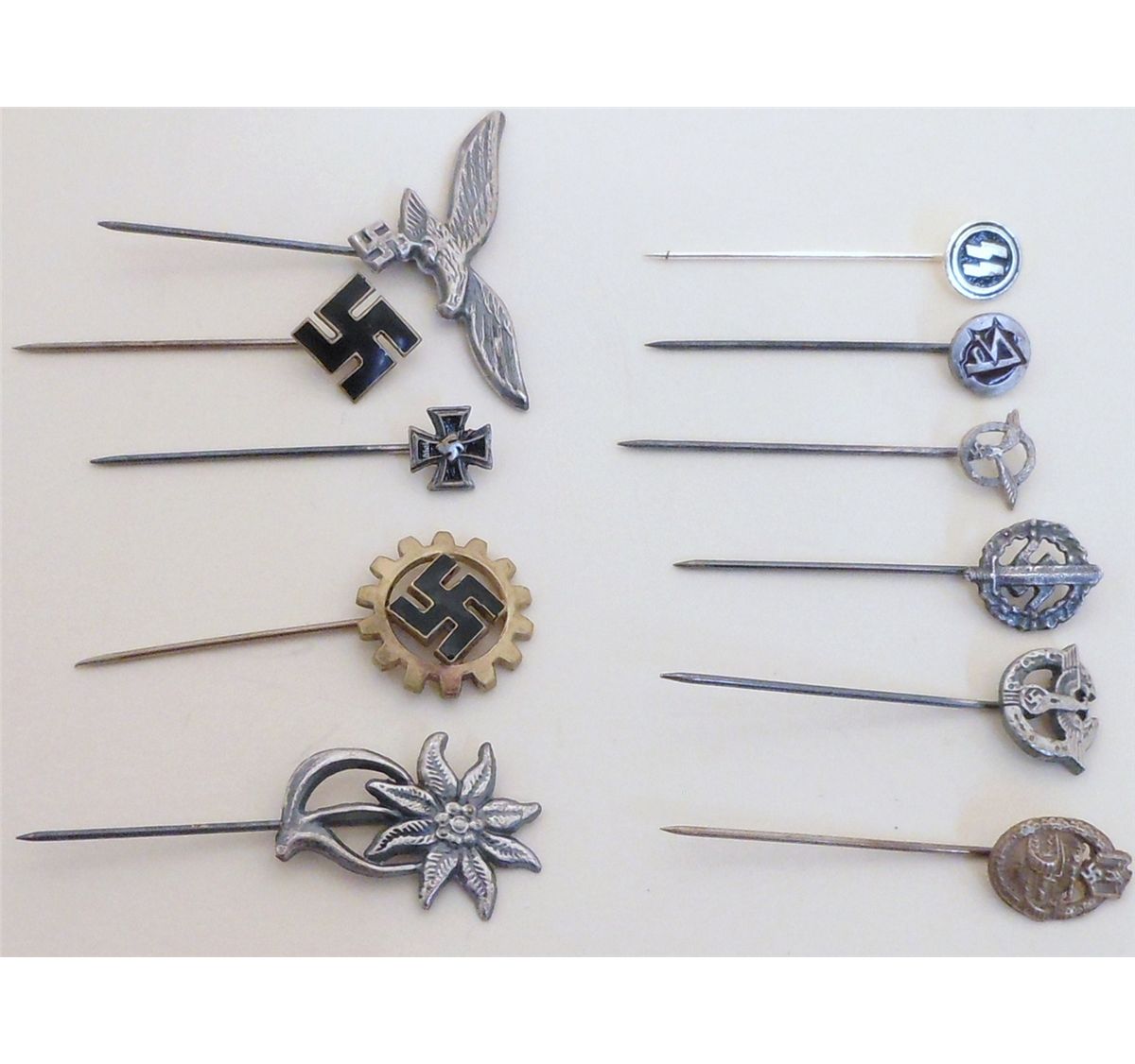 Lot of 11 Assorted German Nazi WWII Stickpins. SS, SA, Mountain Troops, Luftwaffe, NSDAP, RAD(Labor Front), Army Tank Assault, and More. All are in Great Condition.