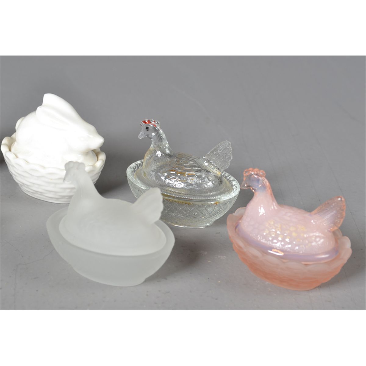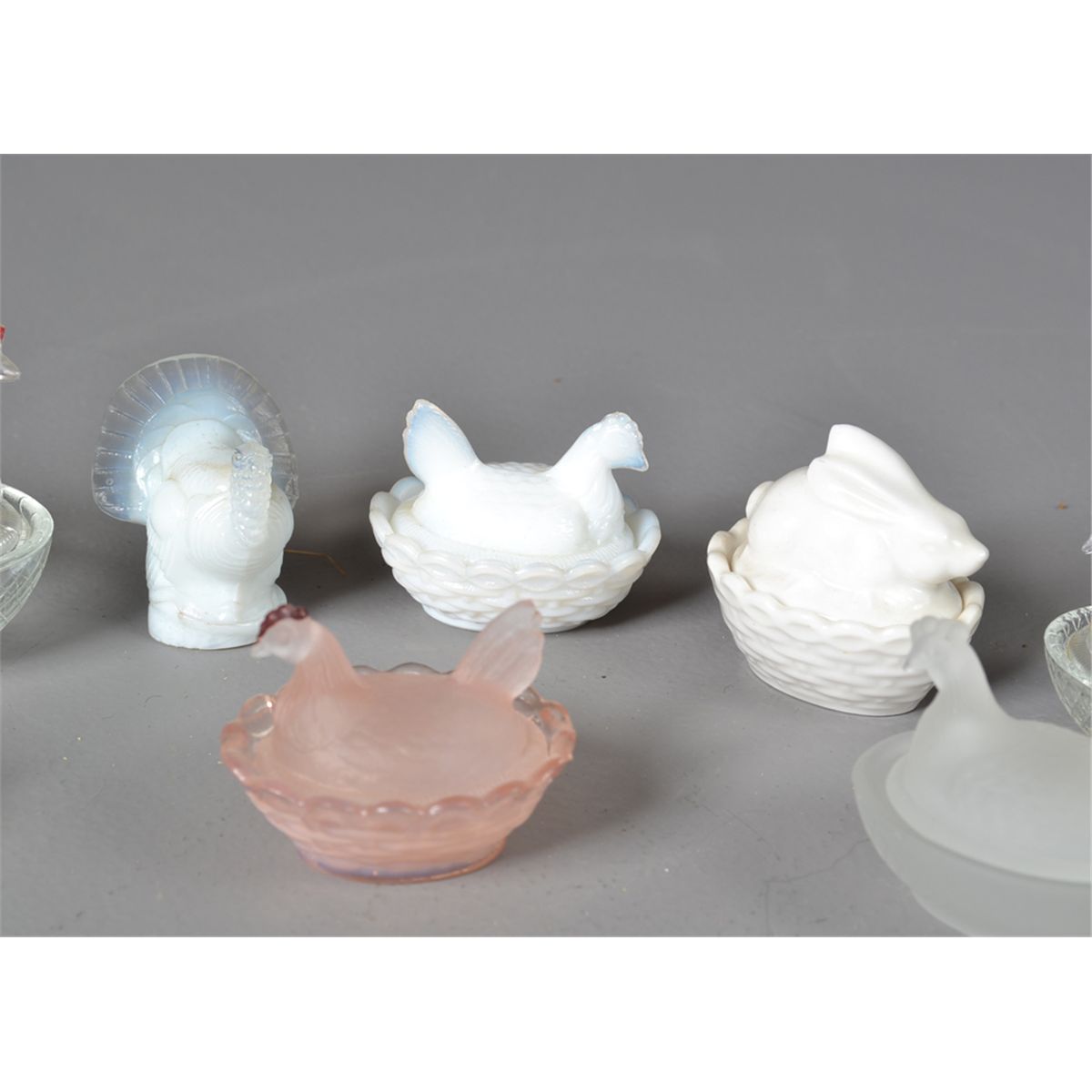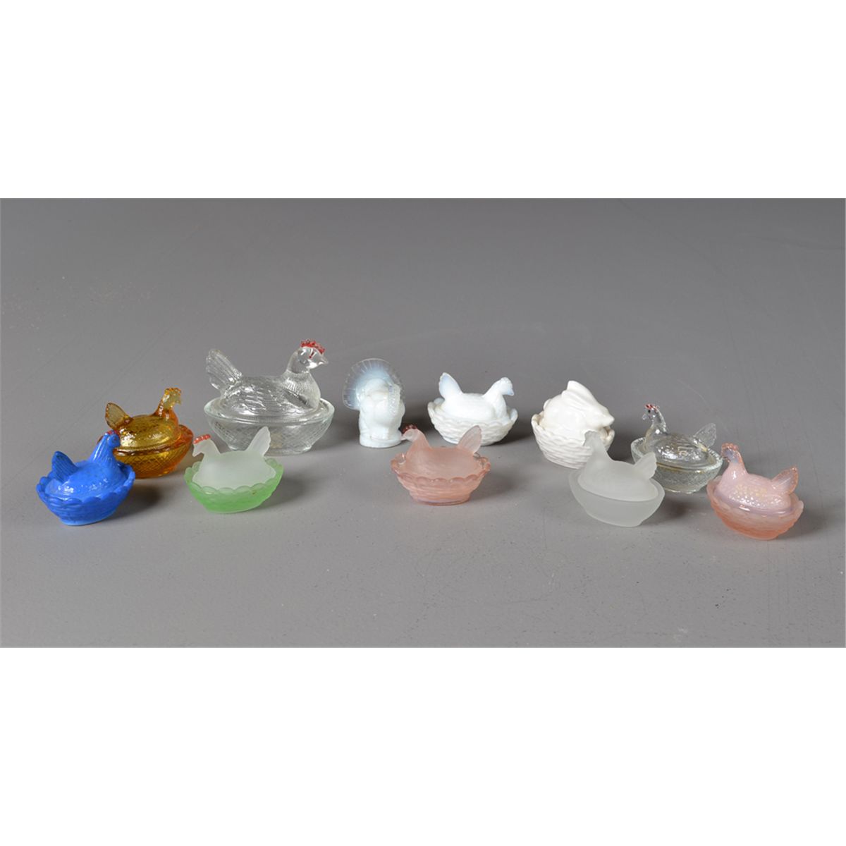 To include ten various color miniature hen on nest covered dishes, together with an opalescent glass turkey. Largest 3" L. Circa early 20th century. Private collection Gregory, MI.
