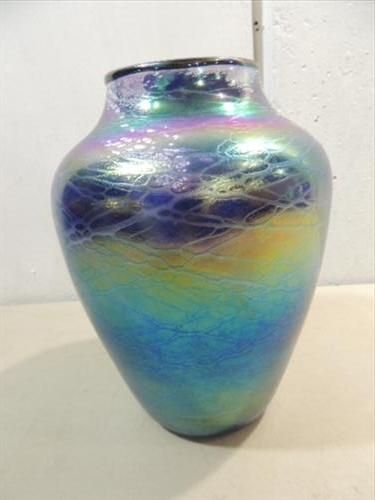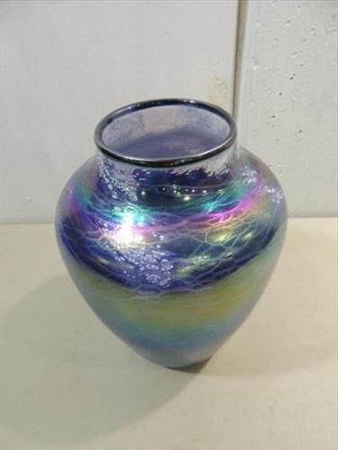 11"H HAND BLOWN TOM STOENNER BLUE IRIDESCENT ART GLASS VASE. HAS TAG INSIDE. AS SHOWN. VIEW PICTURE FOR DETAIL.