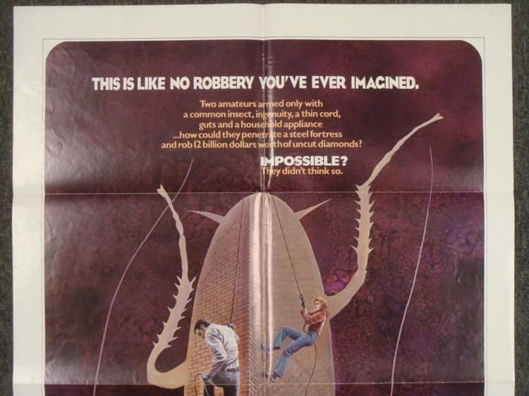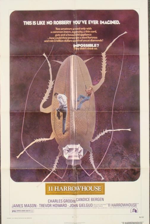 This is an original poster from the 1974 movie 11 Harrow House. The film starred a young Candice Bergen and Charles Grodin as diamond robbers, and this poster portrays them and the insect that's key to their criminal success. Size: 27 x 41 inches (one sheet) Condition: Very good; light wear at the folds, and surface wrinkles